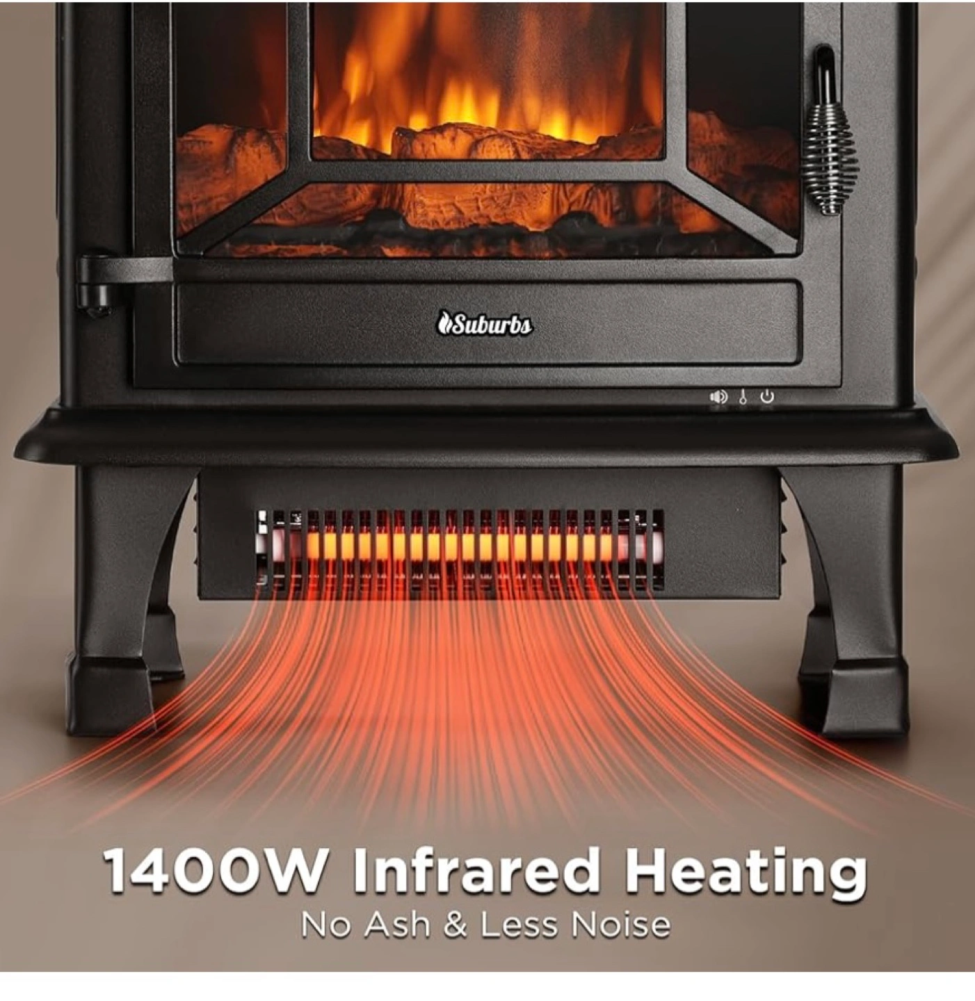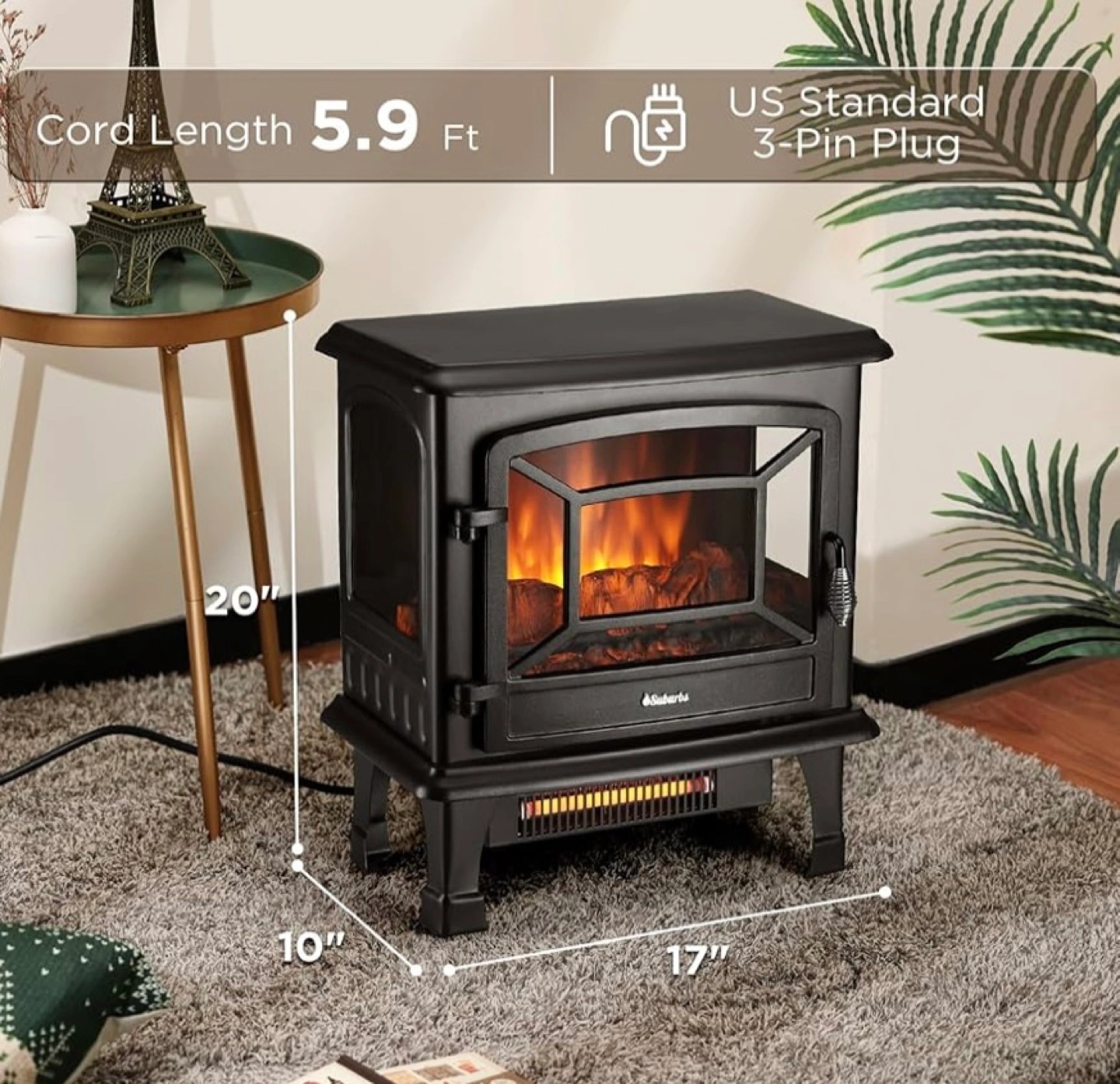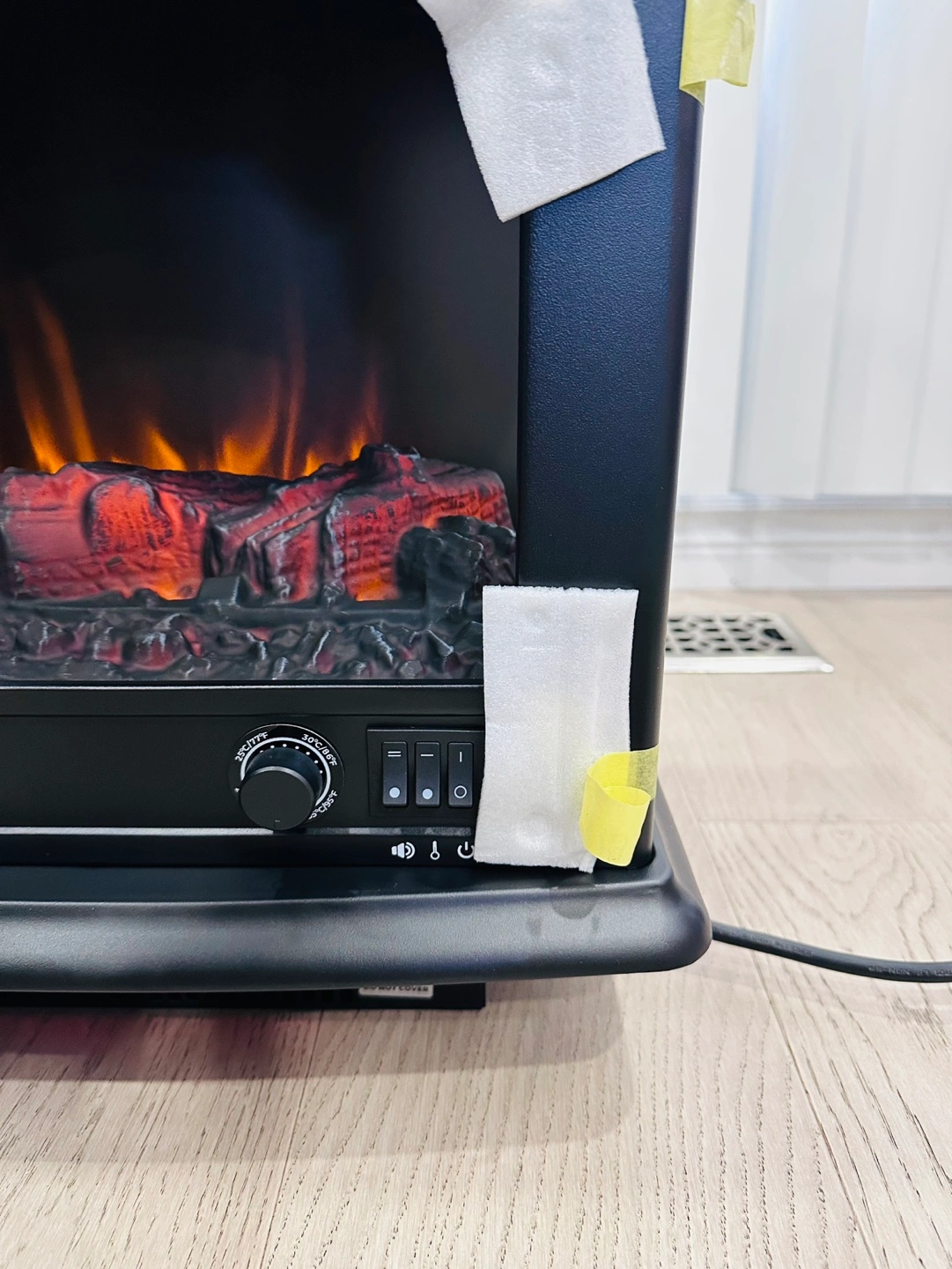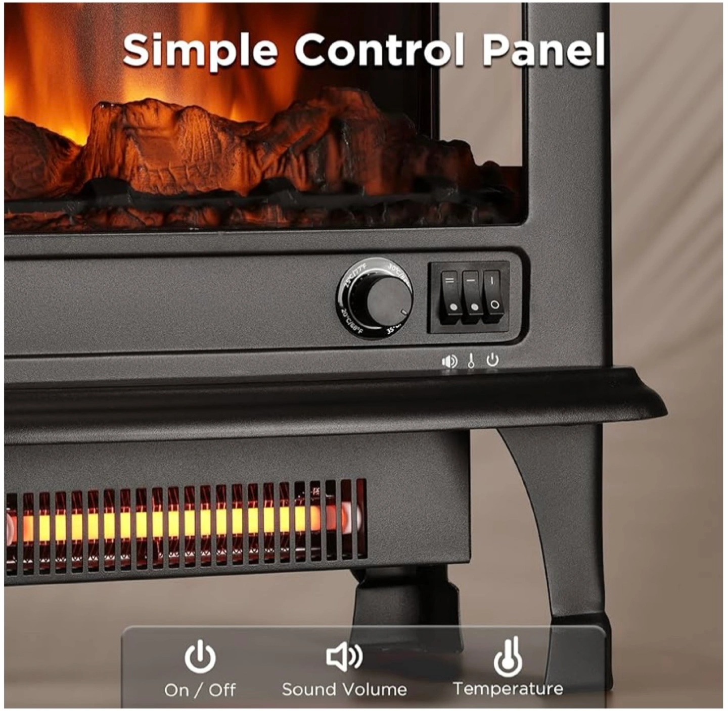 Black electric fireplace. Compact size, ideal for small spaces. Includes user manual and extra feet. Features realistic flame effect. Excellent condition.