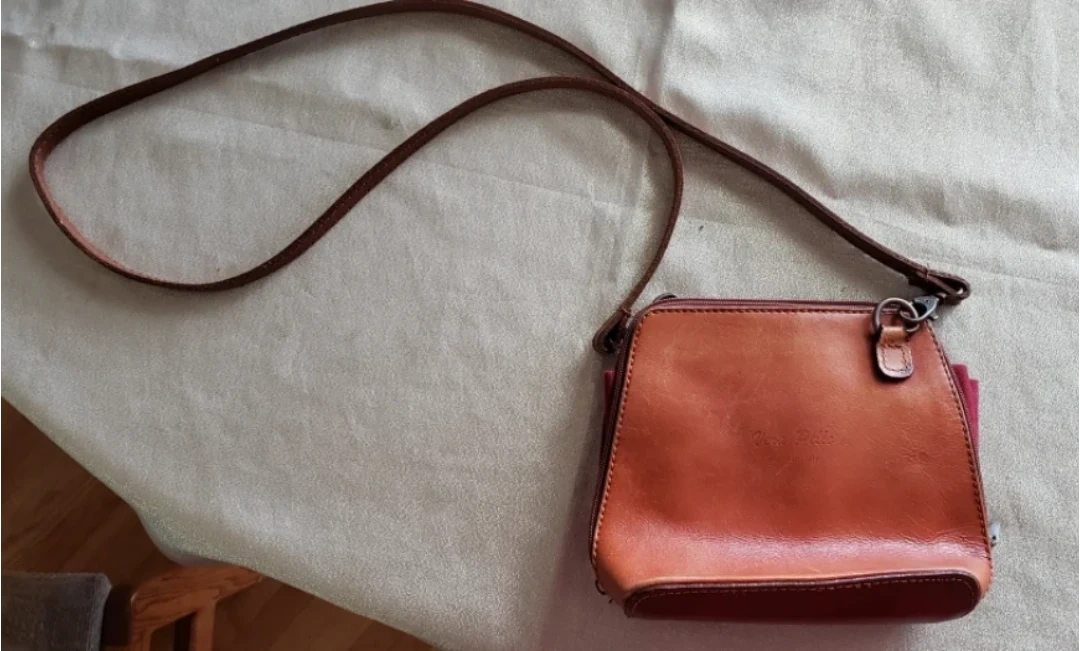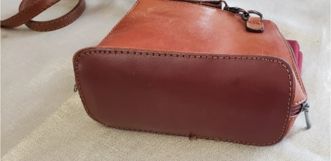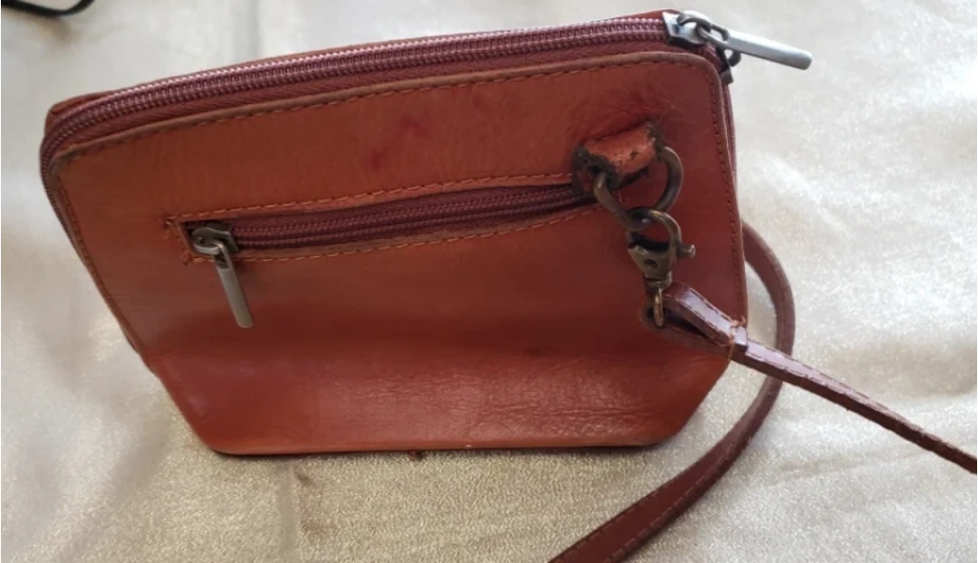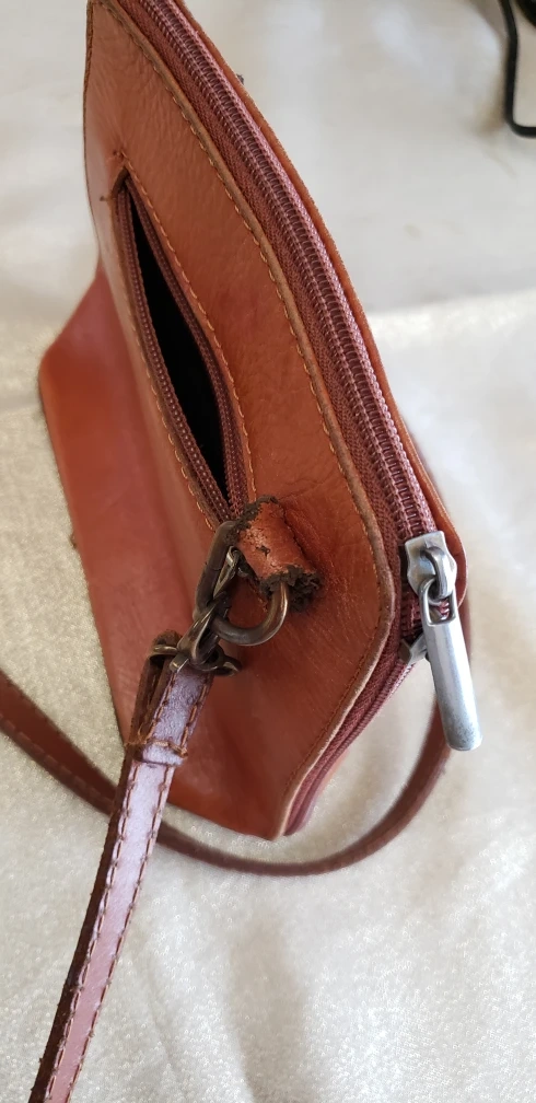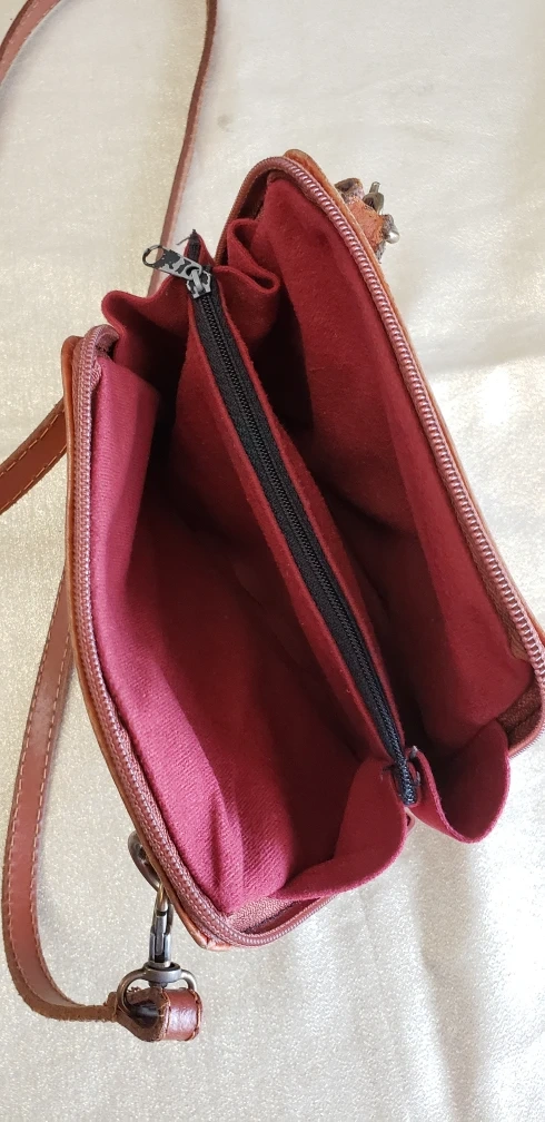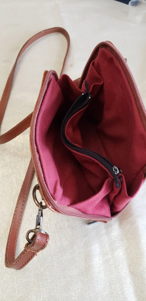 Small brown leather crossbody bag. Features a zip closure and adjustable strap. Interior features a maroon lining and small zip pocket. Excellent for everyday use.