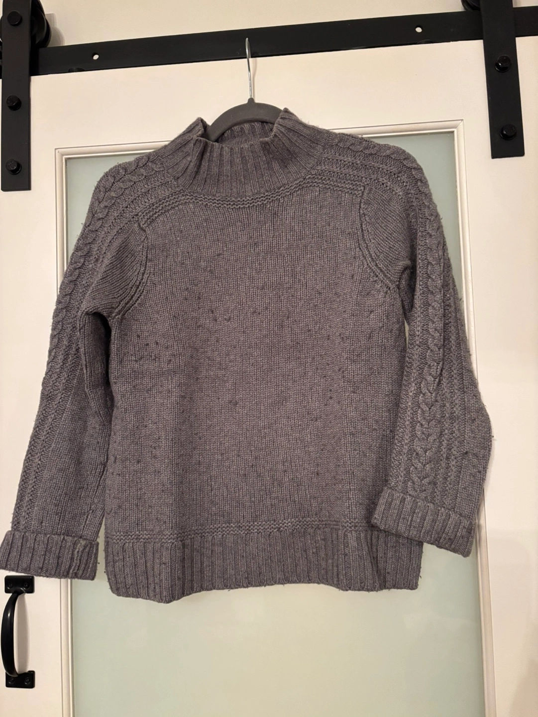 Women's grey mock neck sweater. Features cable knit detailing. Soft material, relaxed fit. If you have a de-pilling machine it will make this look brand new!