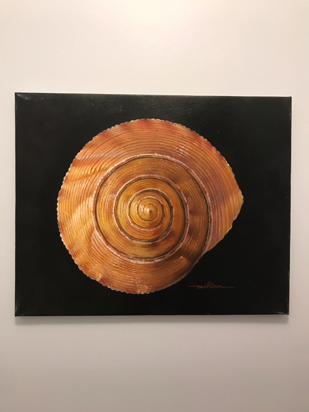 Original artwork. Oil on canvas. Depicts a seashell. Black background. Artist signature visible.