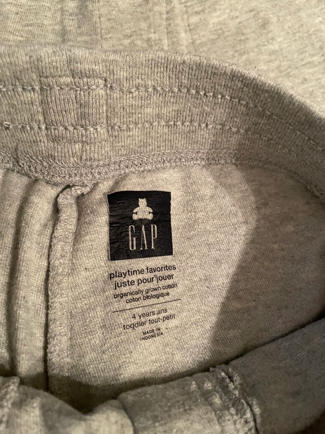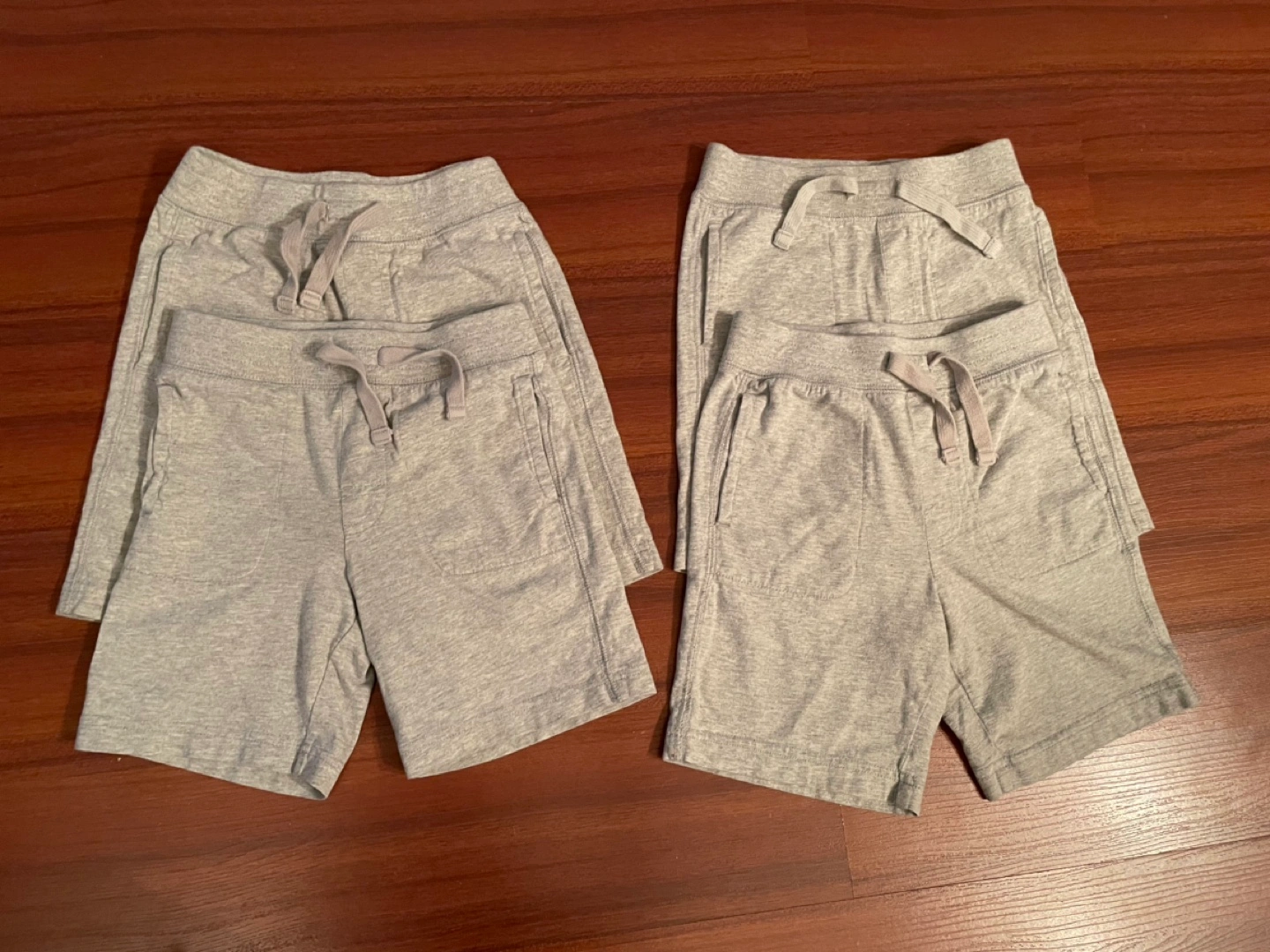 Four pairs of grey Gap toddler shorts. Size 4. Organically grown cotton. Drawstring waist and side pockets.