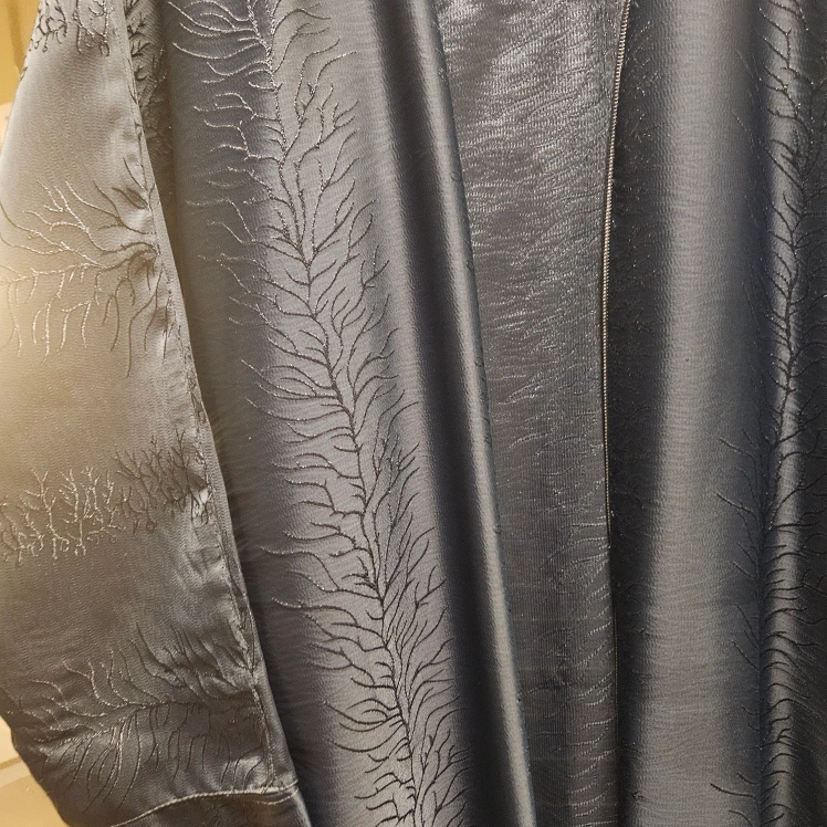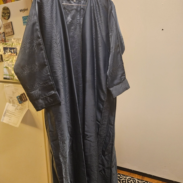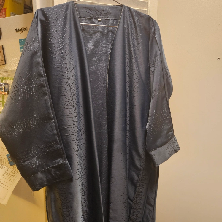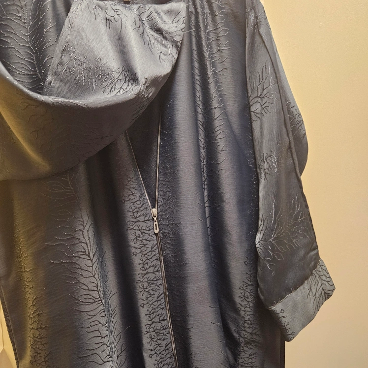 Long navy blue cardigan. Features an embroidered pattern. Three-quarter sleeves. Open front. Zipper detail.
