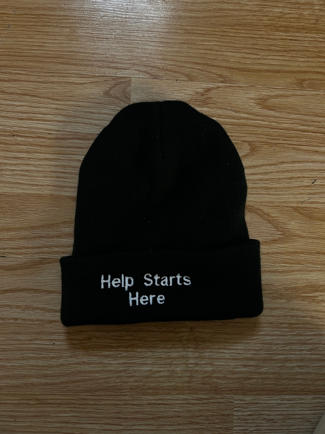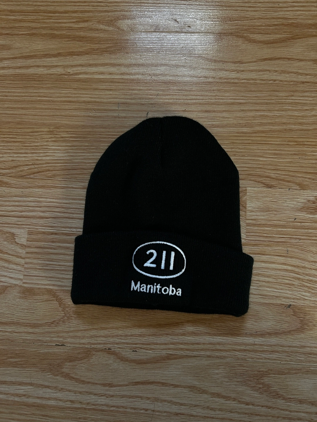 Black knit beanie. Features embroidered text. One beanie says "Help Starts Here." The other says "211 Manitoba." Unisex style. Great for cold weather.