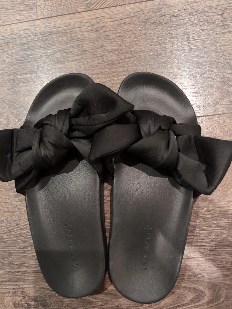 Black satin slides with a knotted bow detail. Size 37. Ted Baker London brand.