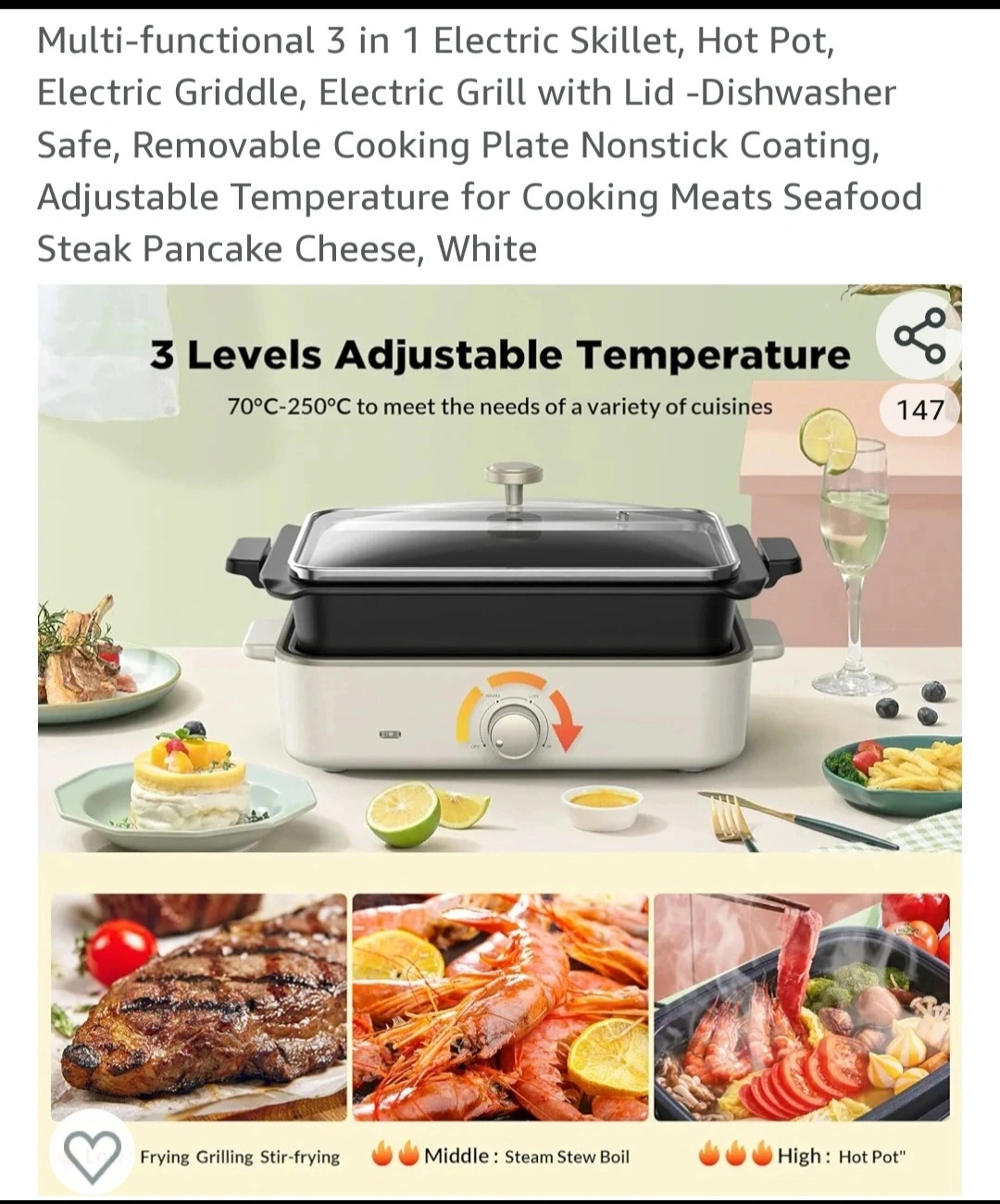 3-in-1 MULTIFUNCTIONAL COOKER] It comes with frying-pan and saucepan and can meet most your needs for cooking. You could braise, simmer, BBQ, griddle, fry delicacy as you like, cuisines include but not limited to fried steak, grilled meat, homemade soup, stew, crepes, etc. [FAST HEATING] Power for 1400W heating plate instead of the heating tube, heats quickly and maintains a consistent temperature, cooks faster than a stovetop pan. It can be used for any meal from Pancakes, Eggs and Bacon for Breakfast, to Pancakse, Crepes, Hot Sandwiches for Lunch to Grilled Steaks, Hamburgers, Chicken, Fish, Pizza, Vegetables and More. [NON-STICK COATING] This electric skillet has a healthy and Eco-friendly non-stick coating compared to conventional cookware. It allows food to release easily from cooking surfaces and highly reduced cleaning effort. All accessories are dishwasher-safe, clean up your electric skillet in less than a minute! Compact design is easy to store and doesn’t take too much space. [PRECISE TEMPERATURE SETUP] 3 Levels of temperature setting: warm, low and high, ranges from 158℉(70℃)-482℉(250℃). One-button temperature adjustment knob, easy to operate and use. You could choose the corresponding temperature for distinct food materials. [SAFE AND EASY OPERATION] Engineered with an advanced thermal fuse that prevents overheating and temperature control easily, the glass lid is effective to cut down on splatter, single one knob is simple to stop for any occasions, safe and easy to use even for the elder Deep pot capacity 3.6Quart(3.4L Grill plate capacity:12x8x1 in condition brand new Danforth and Eglington Pick up only