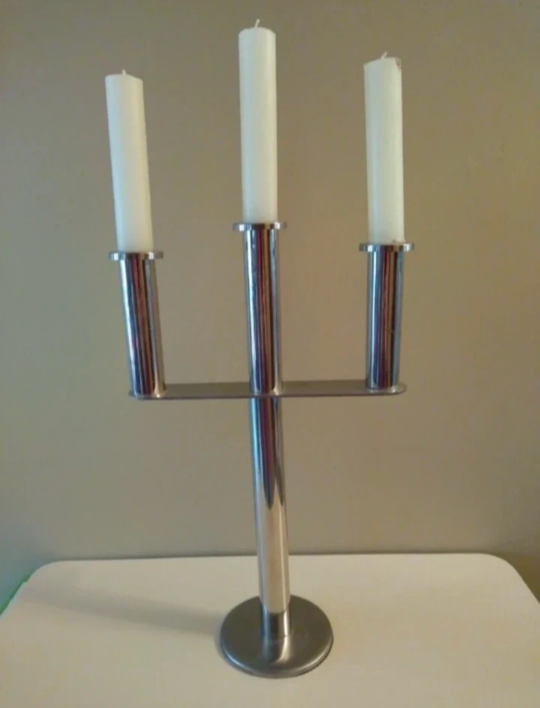 Beautiful brushed nickel candelabra holds 3 candles. Add a touch of ambiance to your dinner table. Perfect for a wedding unity candle set or to light up your dining table!