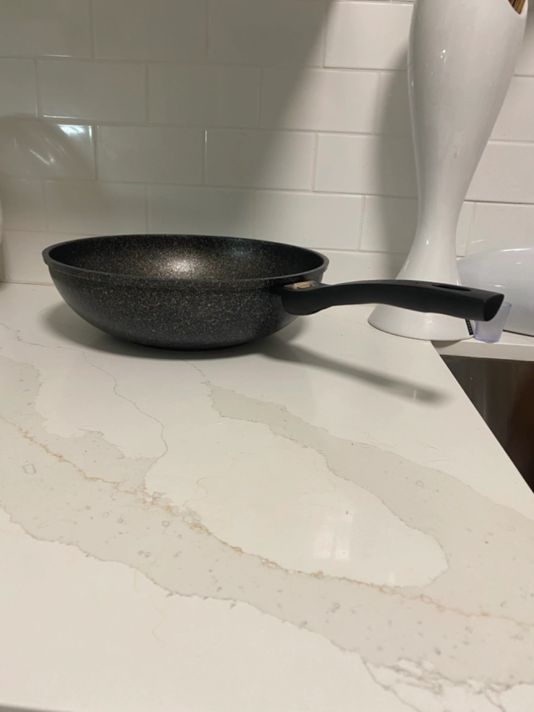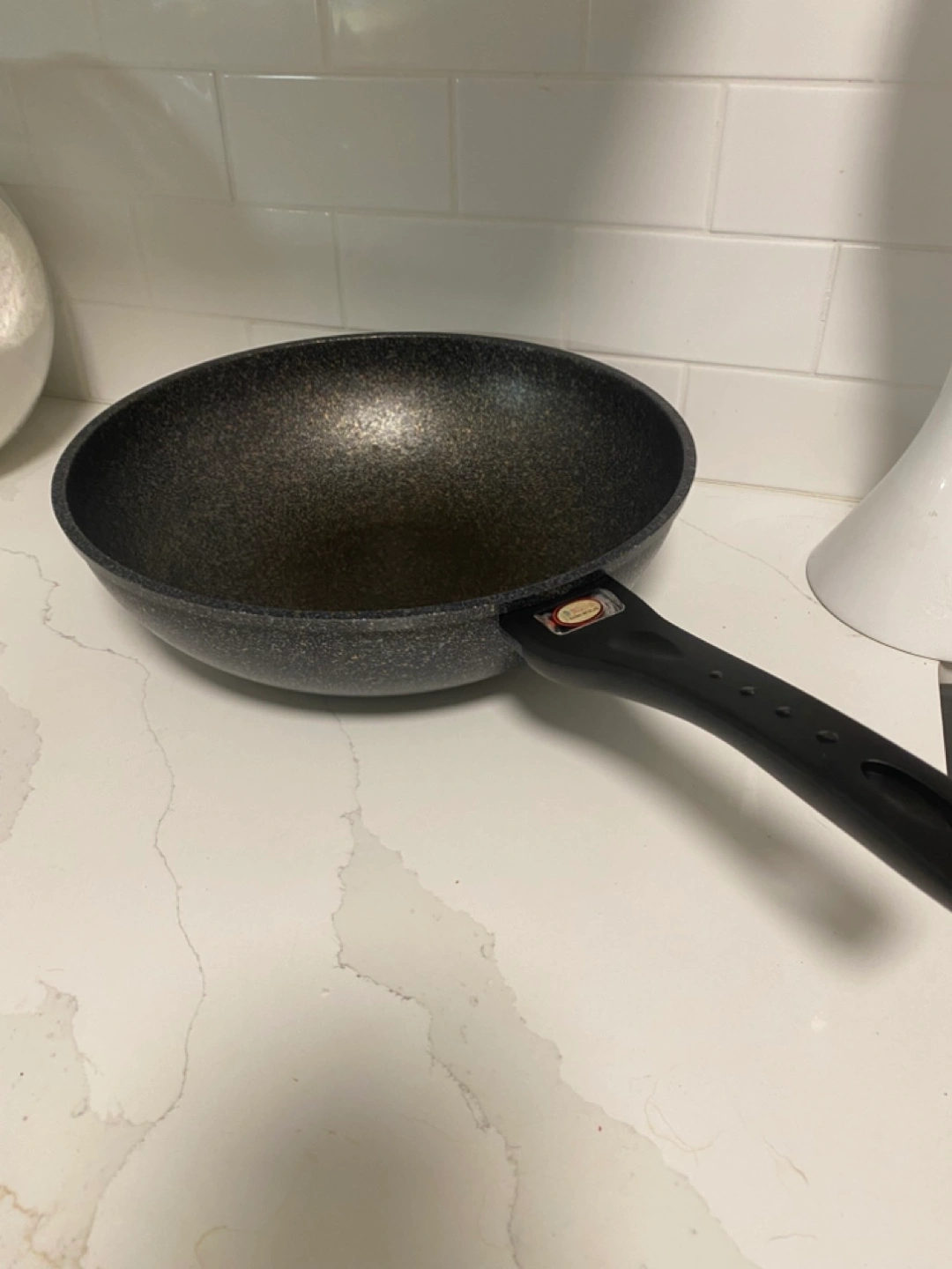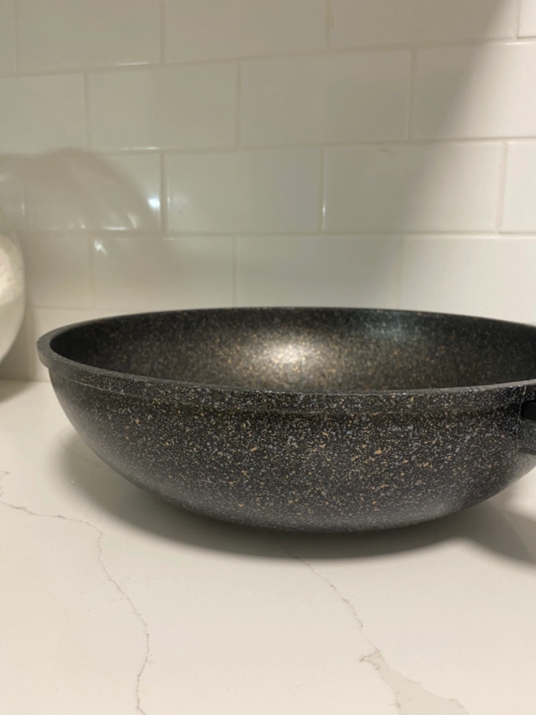 Large wok pan. Stone-look finish. Black handle. Made in Korea. Suitable for various cooktops.