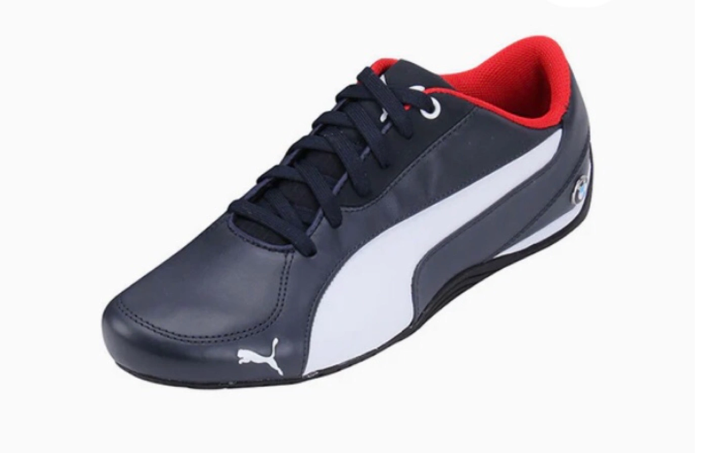 Men's Puma BMW Motorsport sneakers. Navy blue, white, and red colour scheme. Leather upper. Lace-up closure. Low-profile design. Very clean, minor signs of wear, otherwise like new Size US 8.5 length 26.5 cm