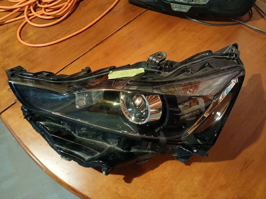 Used Lexus IS300 headlight. Passenger side. Some scuffs and scratches. Complete assembly. Minor damage.