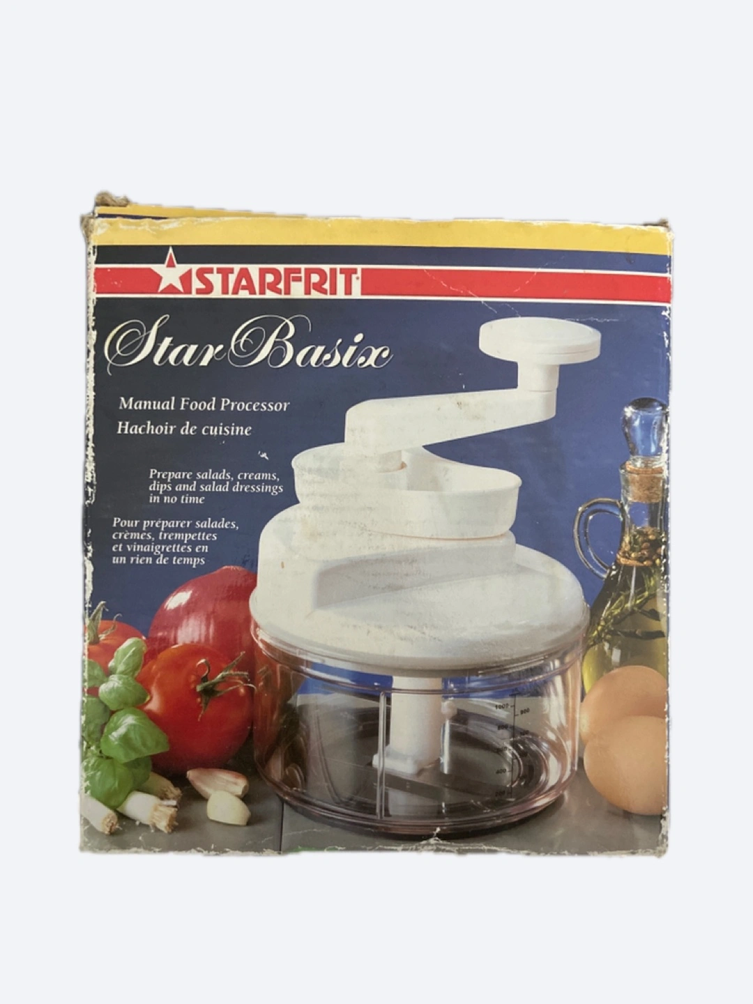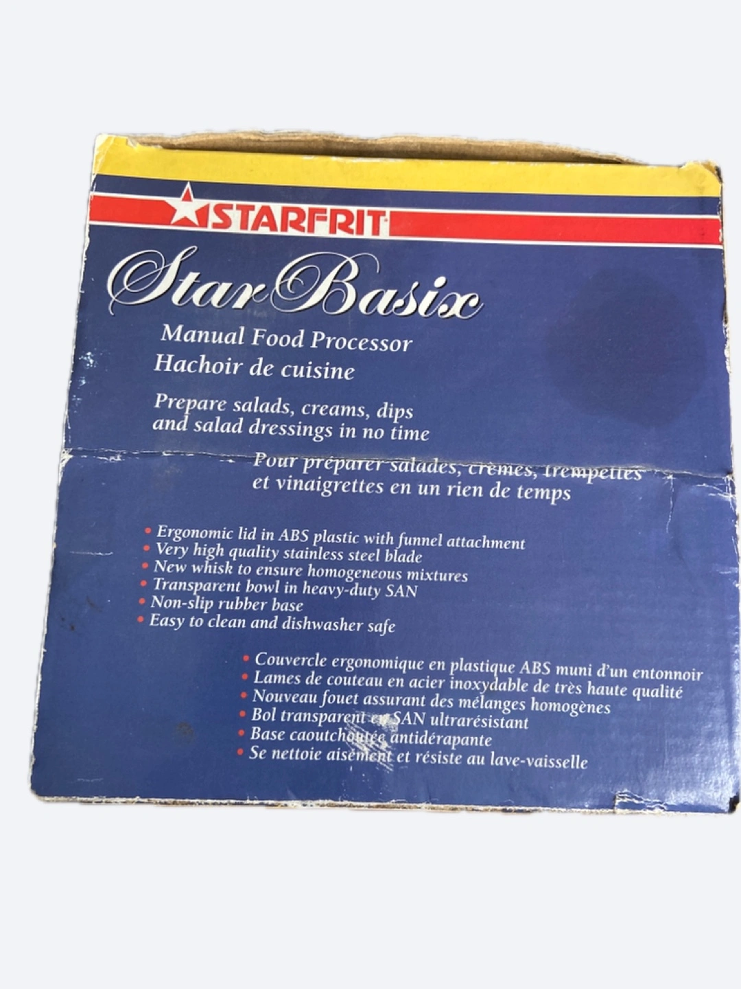 Vintage Starfrit Star Basix manual food processor. New, never used. Includes all parts. Prepare salads, creams, dips and salad dressings quickly. Ergonomic lid, high-quality stainless steel blade, and non-slip base. Easy to clean and dishwasher safe.