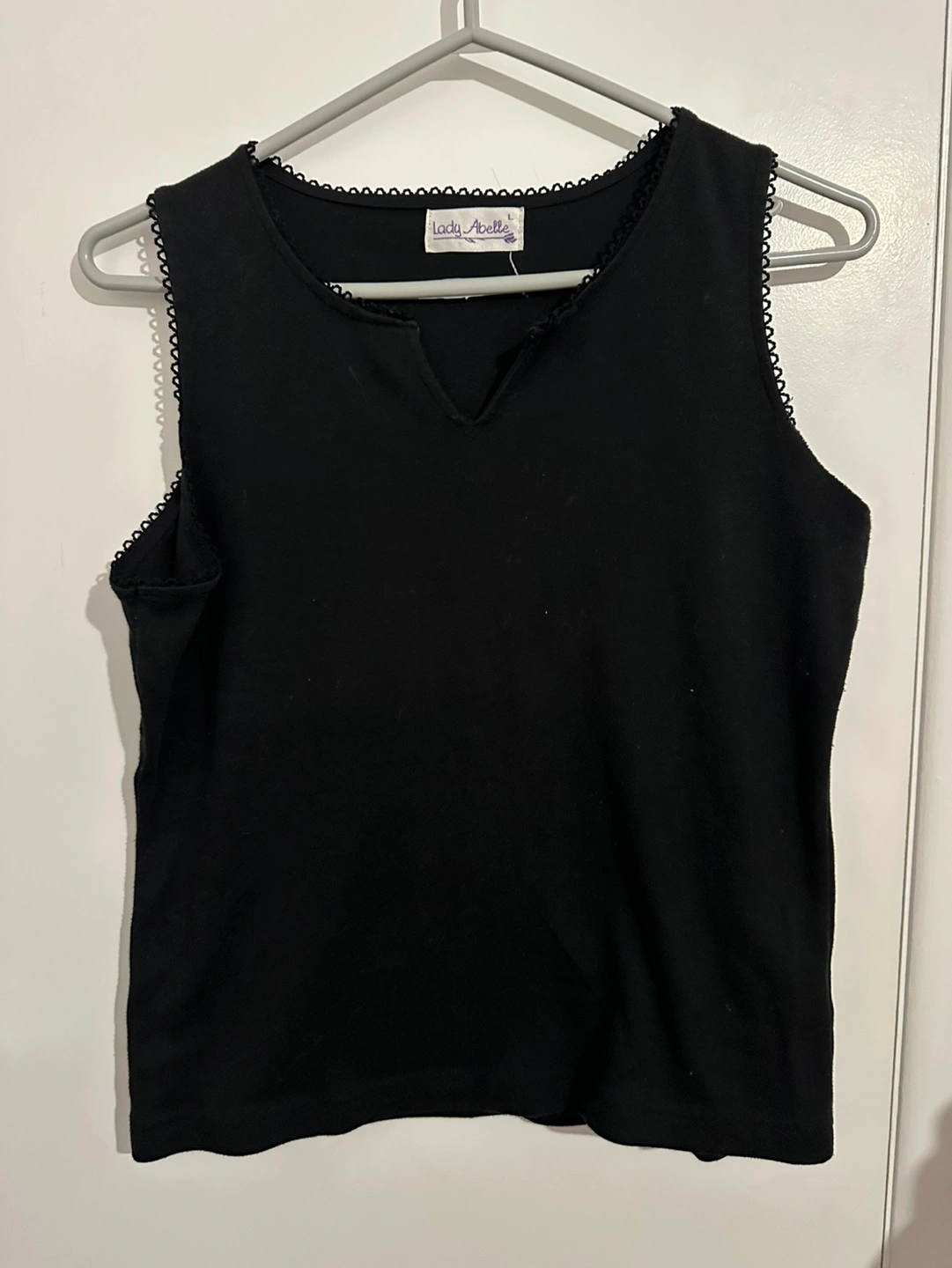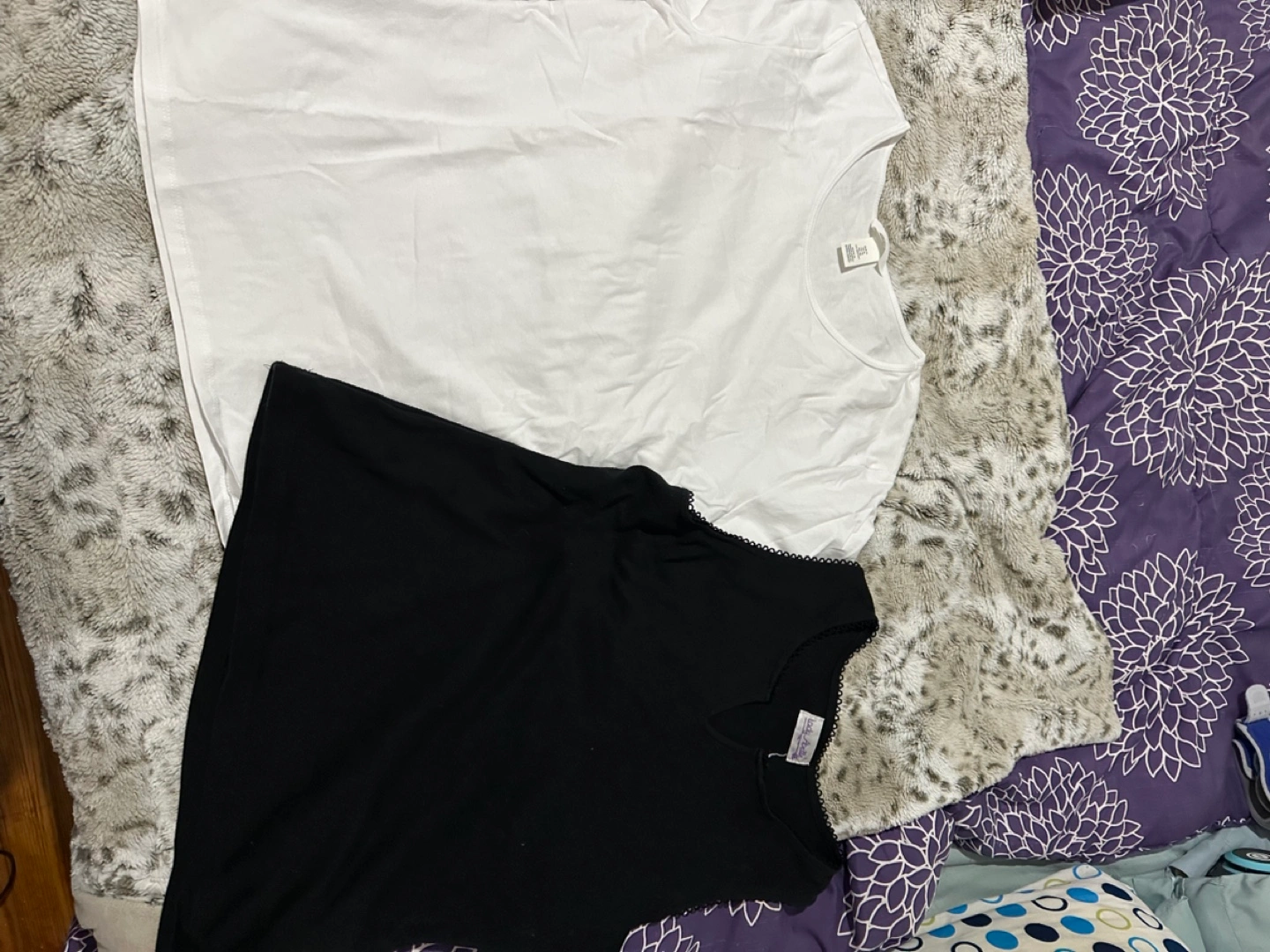 Bundle includes one white short sleeve H&M T-shirt and one black sleeveless Lady Belle tank top. Both are women's tops. White t-shirt is XL and black tank is L. Both in good condition with no holes or loose threads, closet clean out. Smoke free home.