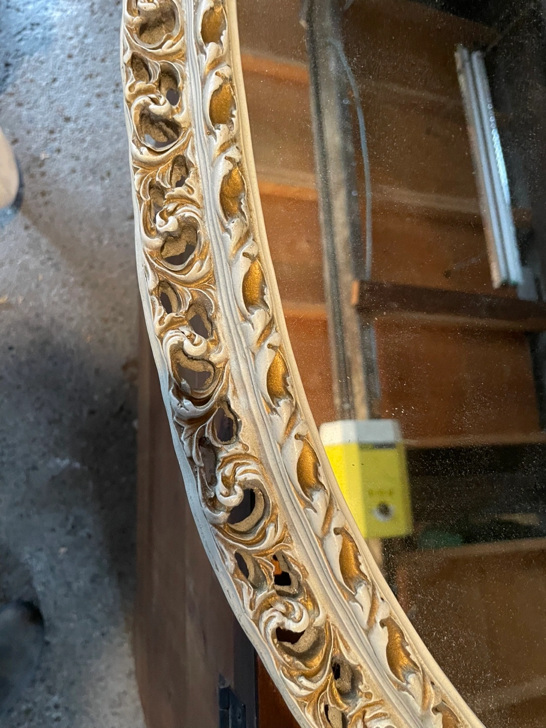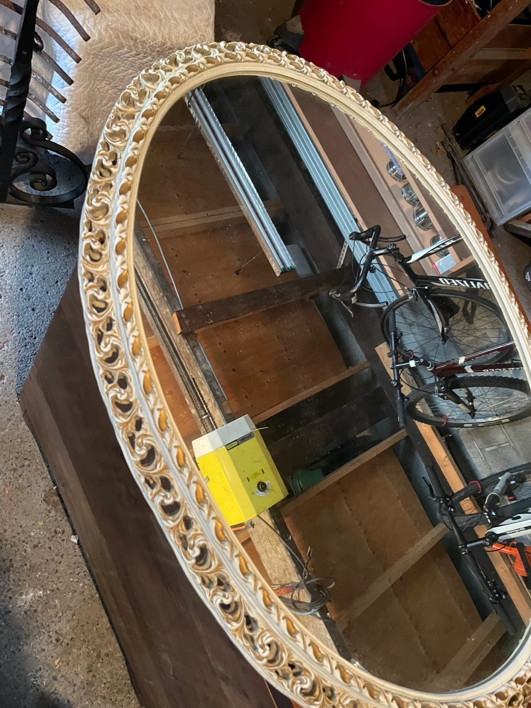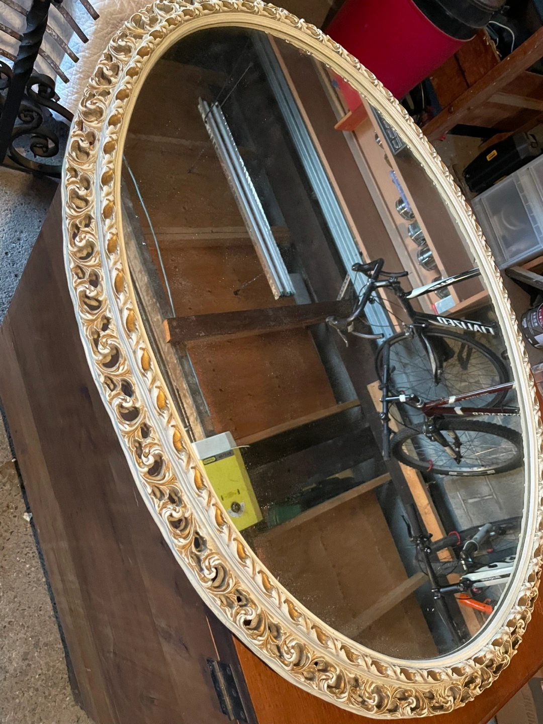 Large oval mirror. Intricate, ornate frame. Gold and off-white colours. Gorgeous Vintage piece Great for bathroom or hallway or bedroom 34 inches tall, 26 inches wide Pick up near Yonge and eglinton