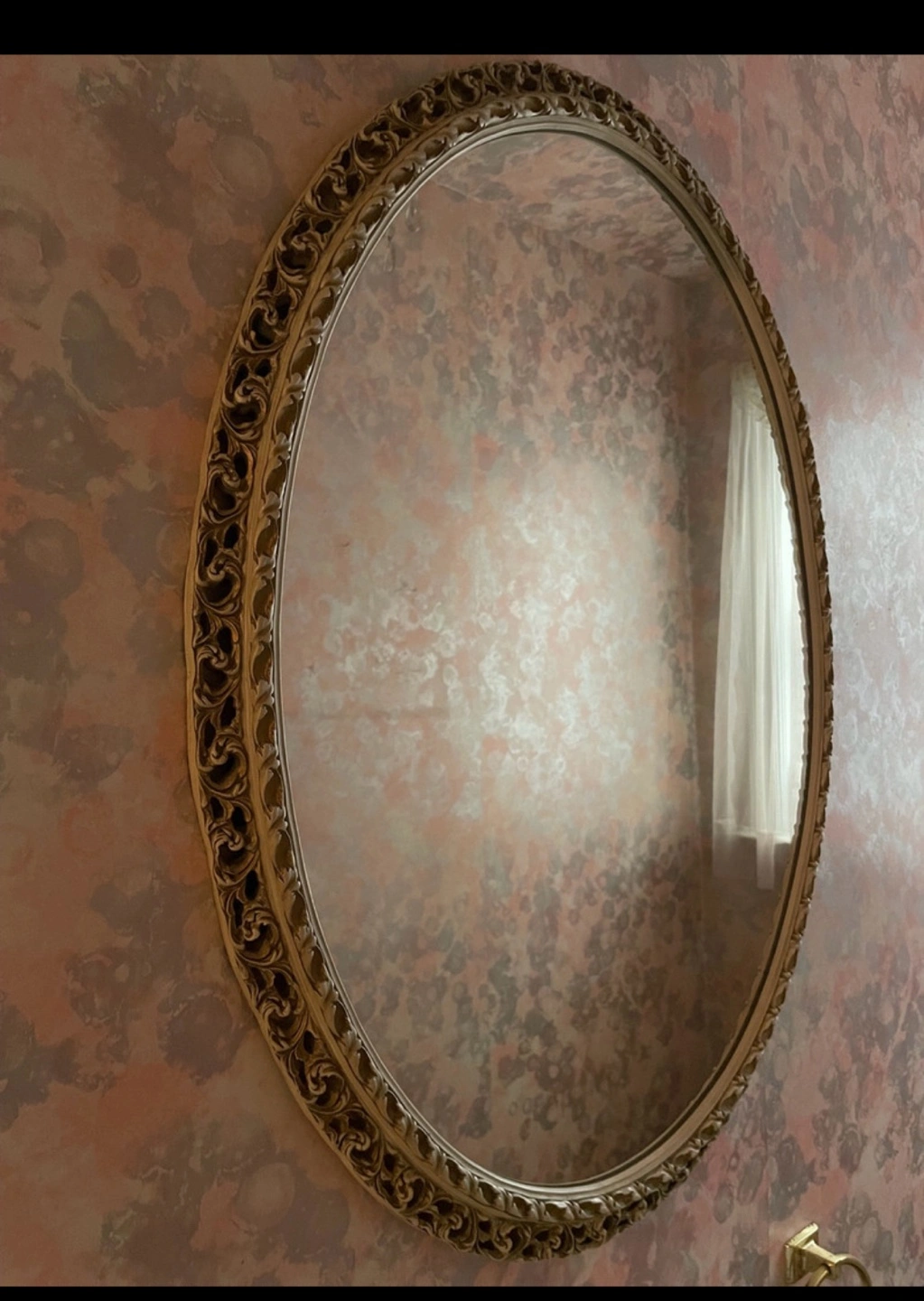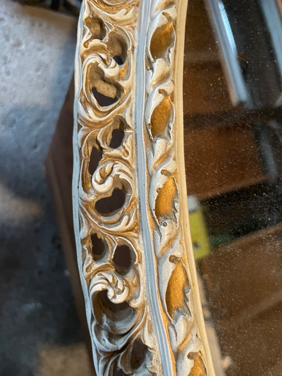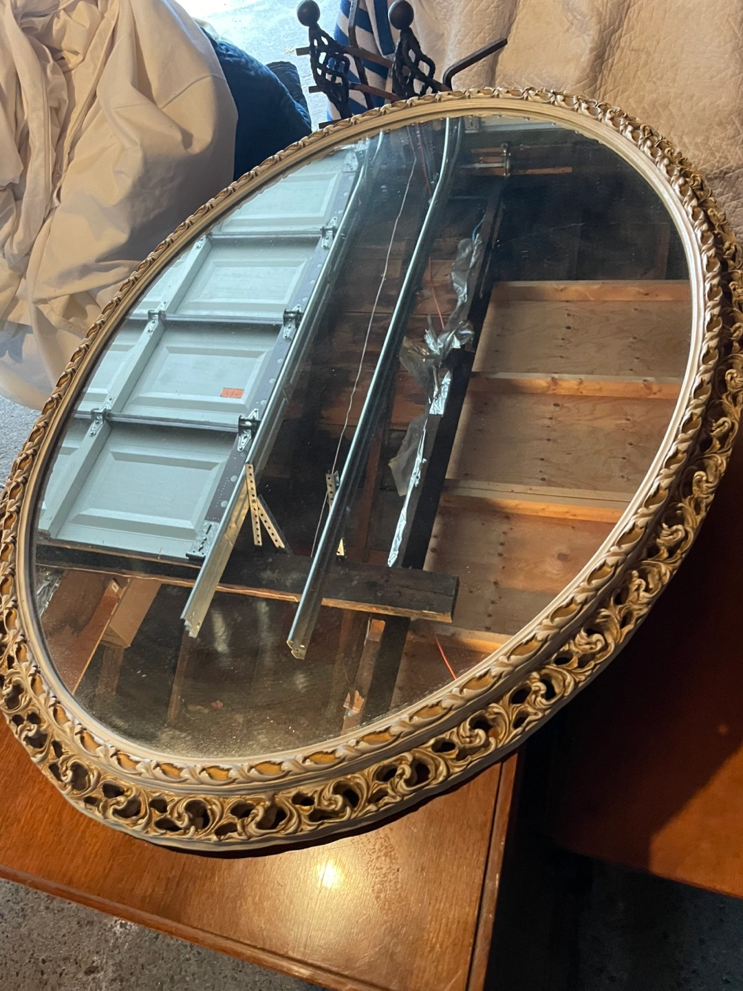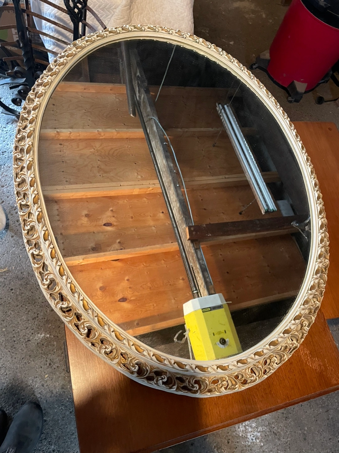 Large oval mirror. Intricate, ornate frame. Gold and off-white colours. Gorgeous Vintage piece Great for bathroom or hallway or bedroom 34 inches tall, 26 inches wide Pick up near Yonge and eglinton