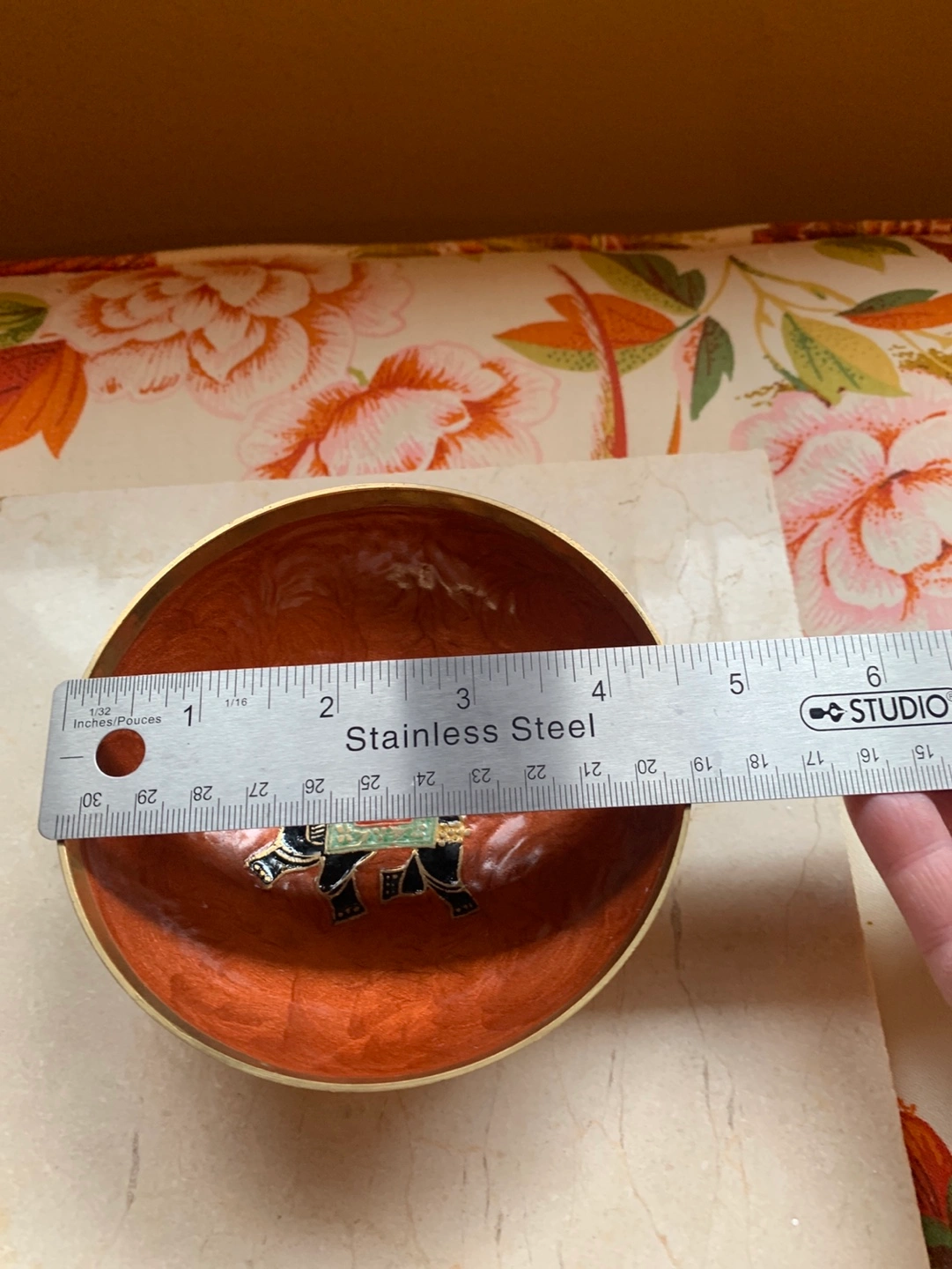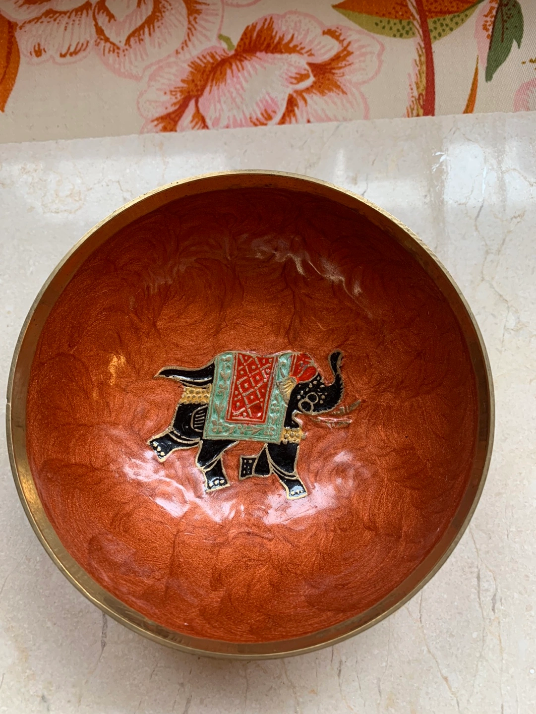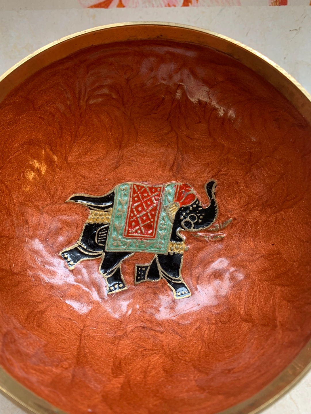 Beautiful brass small pedestal bowl. Features an orange/terra cotta interior with an enamel elephant design on black, gold and green. A very unique decorative piece. Perfect for trinkets, keys, candy or just to beautify your home. Cash only please.