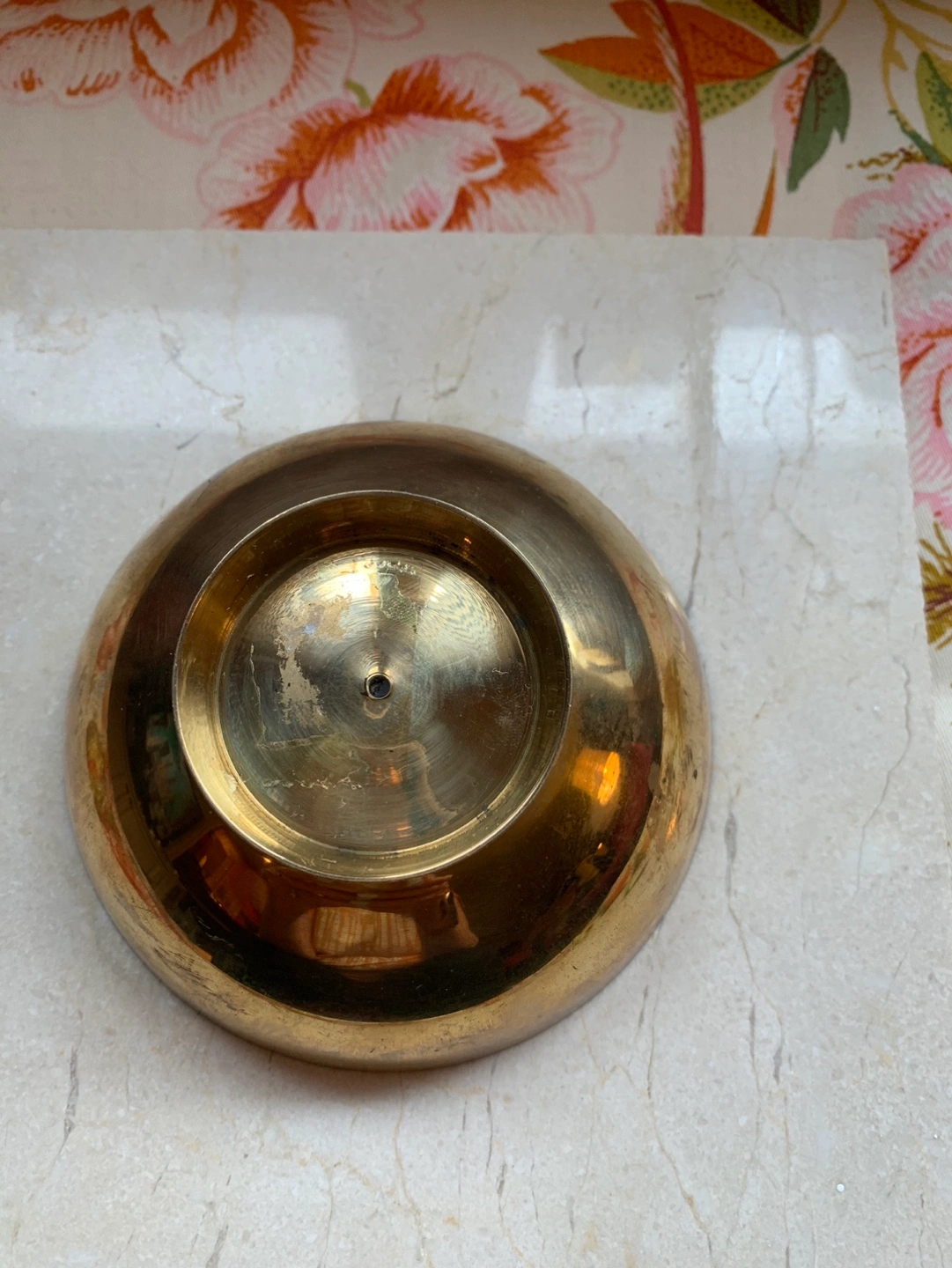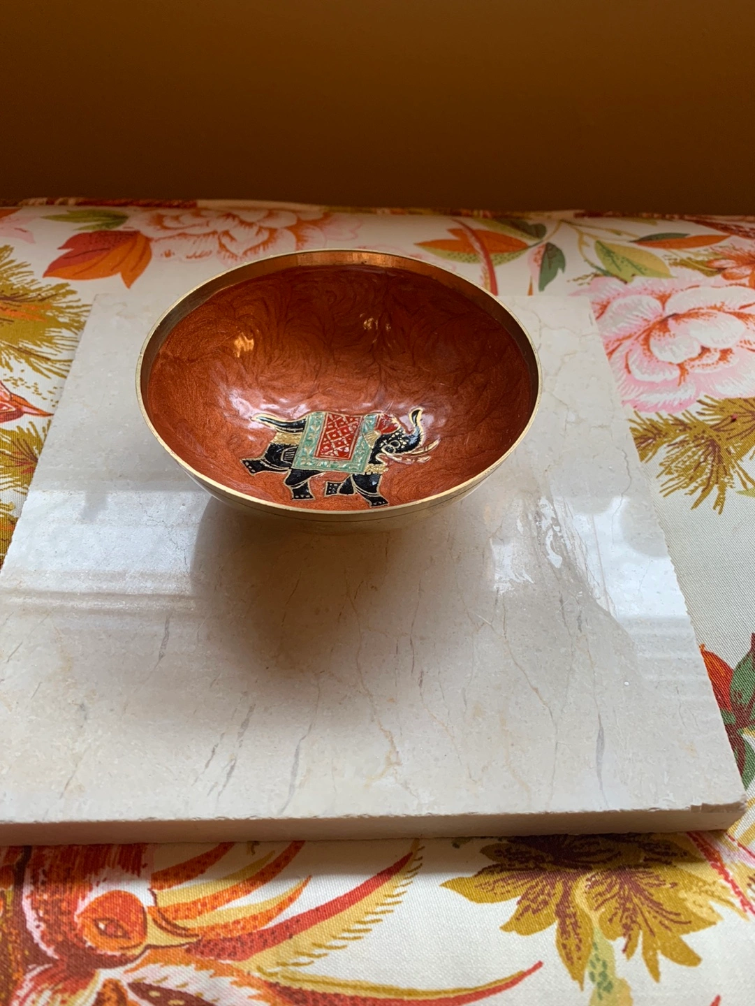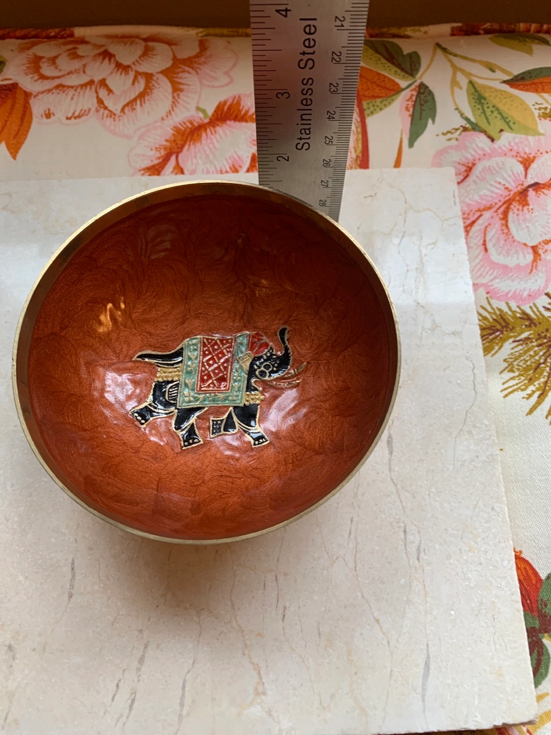 Beautiful brass small pedestal bowl. Features an orange/terra cotta interior with an enamel elephant design on black, gold and green. A very unique decorative piece. Perfect for trinkets, keys, candy or just to beautify your home. Cash only please.