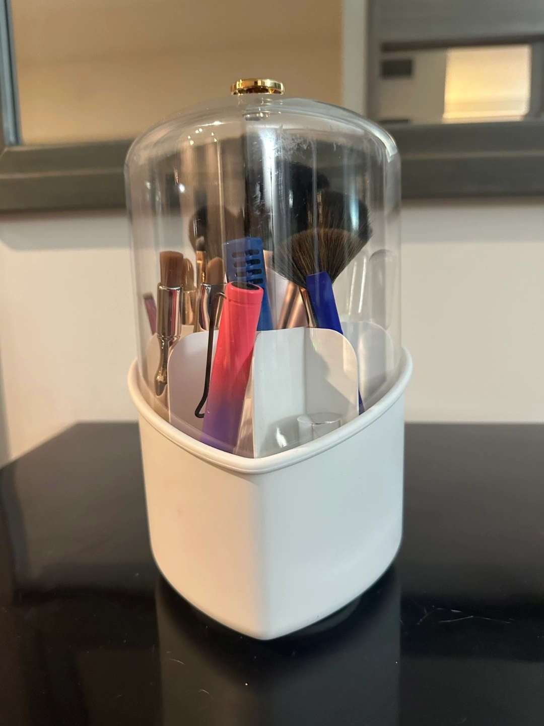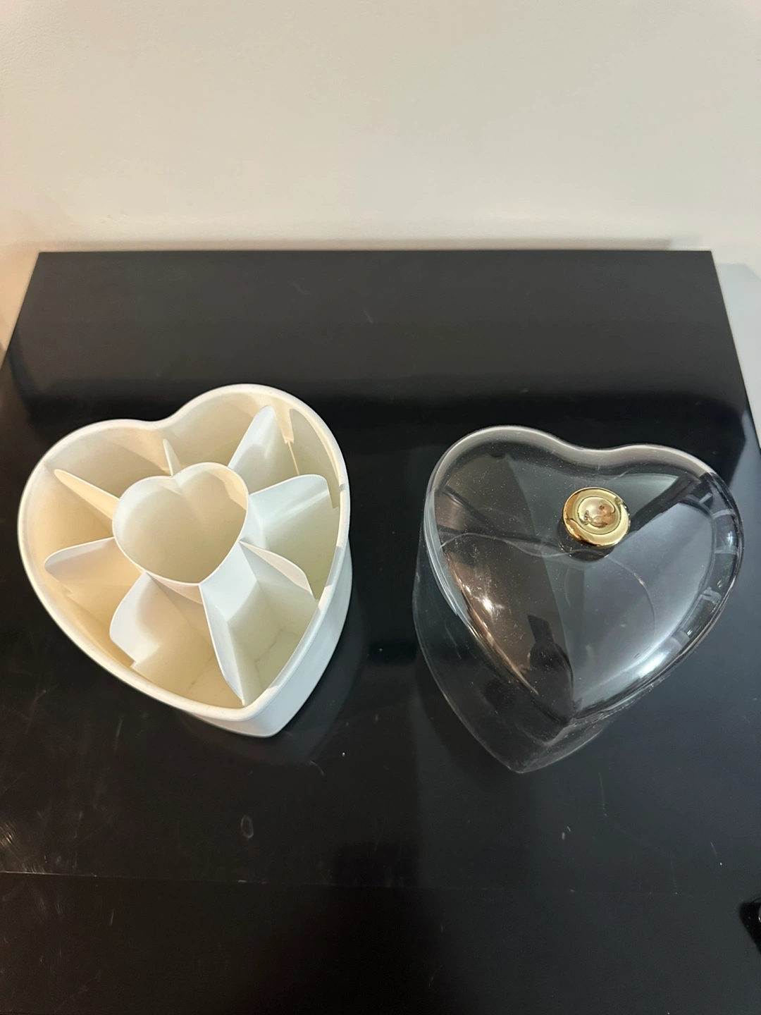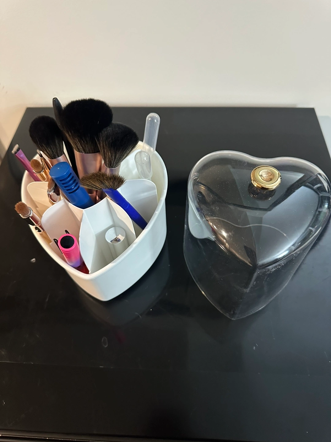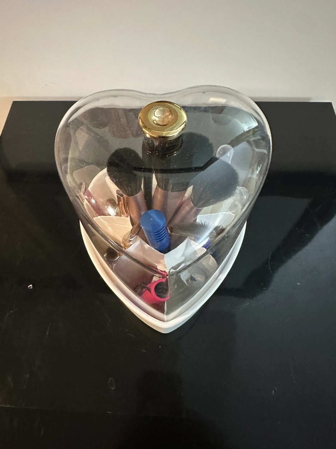 Rotating heart-shaped organizer for makeup brushes. White plastic base with compartments. Clear plastic dome lid. Perfect for keeping brushes clean and organized. Excellent condition, I just don’t use it anymore. Pick up in Brentwood concord, commercial-broadway or granville skytrain station, or we can arrange a pick up point