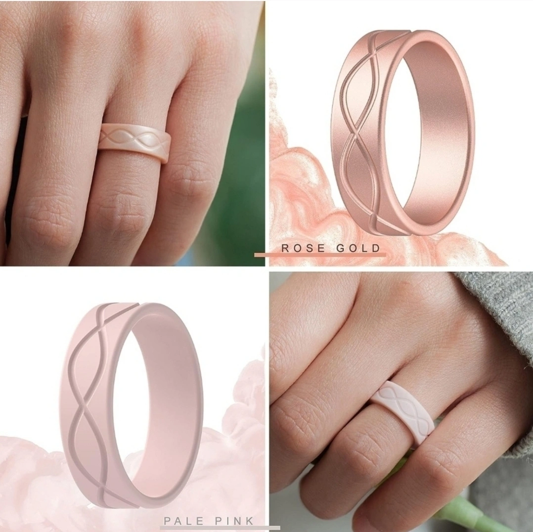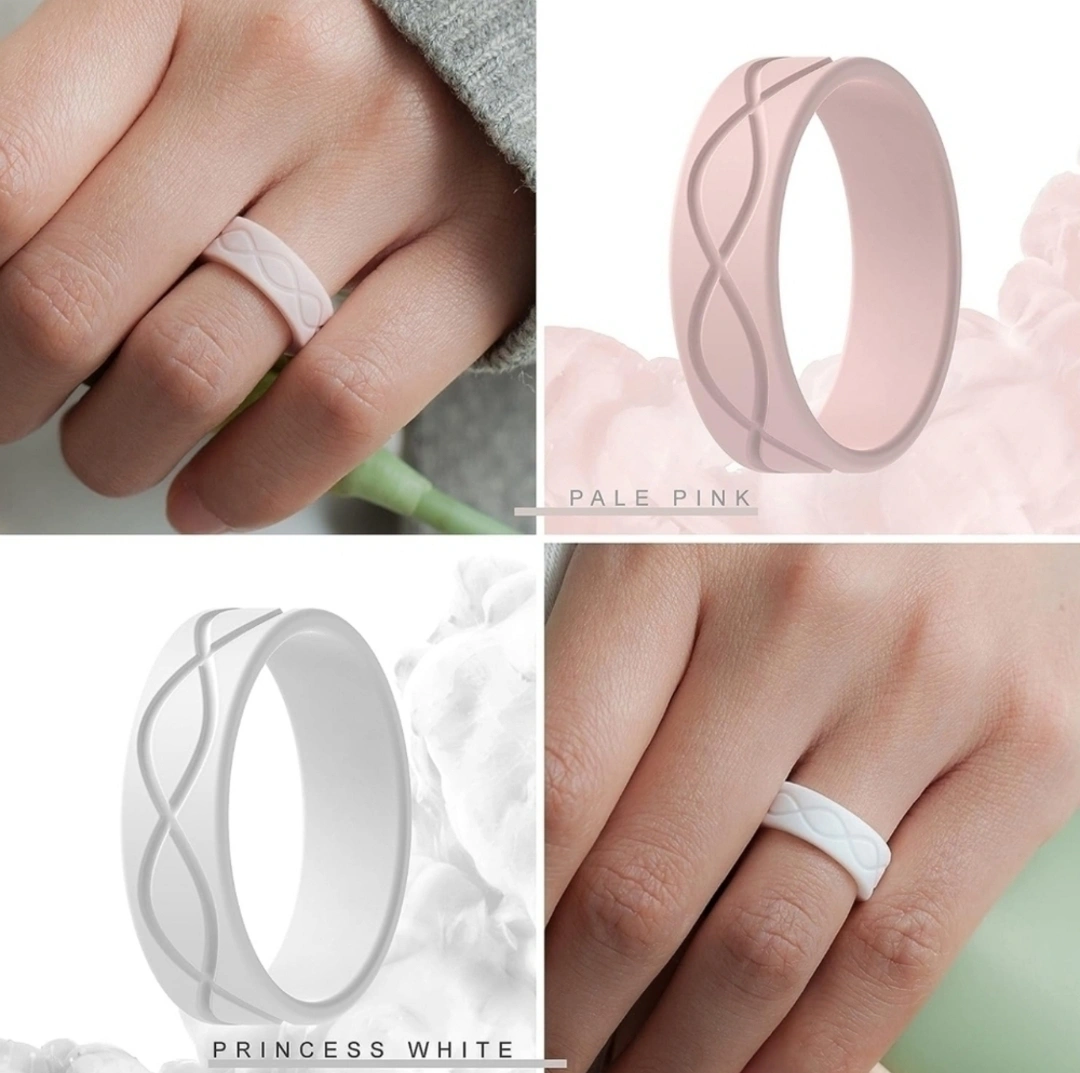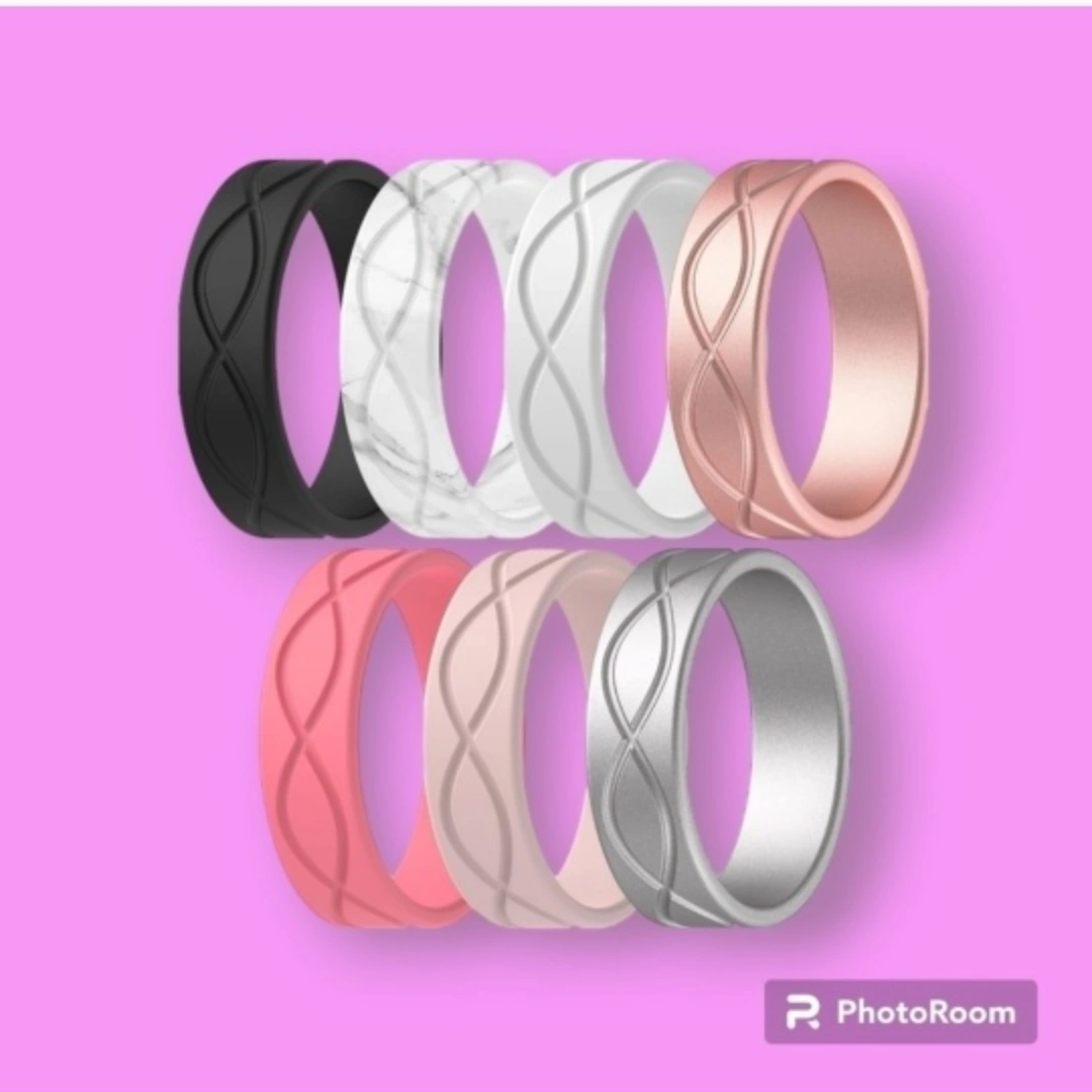 Unisex Silicone Infinity Design Wedding Bands Set of 7 - new in packaging, never been used. Size 11 for men Size 12.5/13 for women Includes: White, White Marble, Silver, Rose Gold, Pink, Pale Pink, and Black. These silicone wedding bands will be great in replacing your formal wedding band to keep it safe from being scratched or damaged. It is also perfect for extreme duties & manual labor work such as construction, military duties, renovation, painting, and more. The silicone flexible wedding ring (dome style) has an awesome smooth ergonomic design on the top combined with a perfect comfort fit design on the inside. All combined with an amazing classic wedding ring design to create the perfect silicone wedding band.