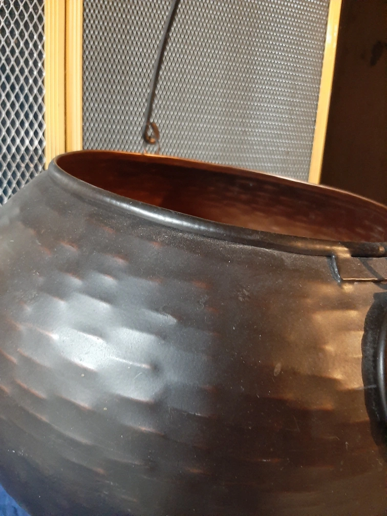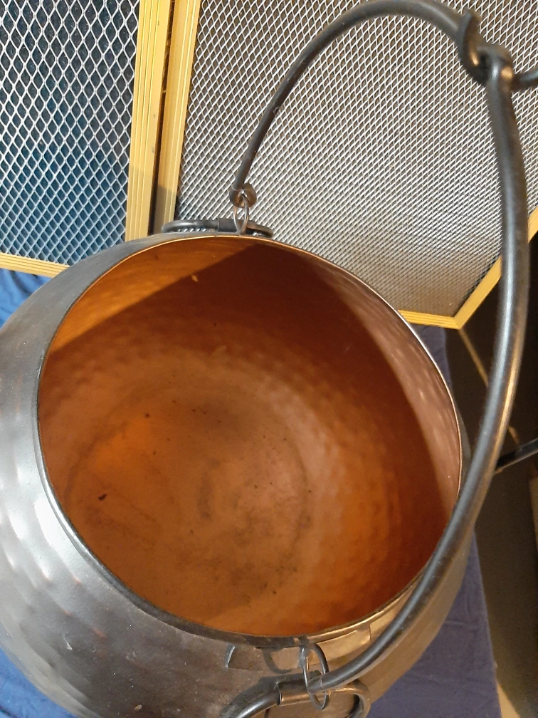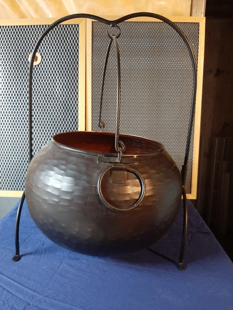 Large copper cauldron. Features hammered texture. Includes metal stand with hanging hook. Perfect for decoration or candy.