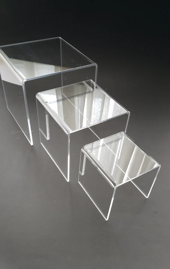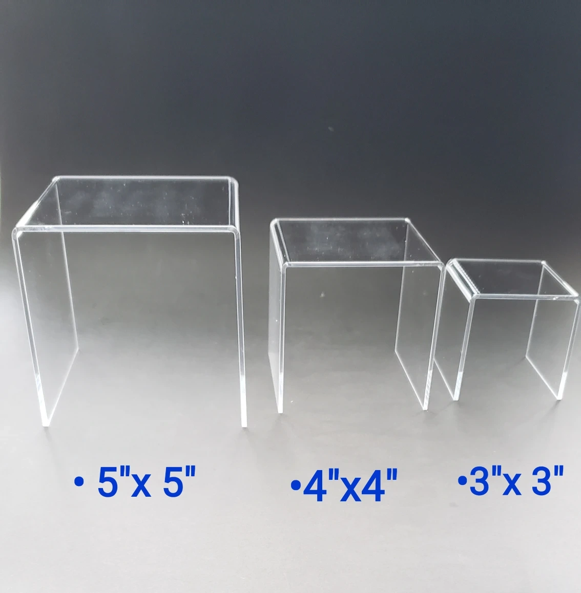 Three clear acrylic risers. Perfect for displaying collectibles, jewellery, or other small items. Set includes one each of 5x5, 4x4, and 3x3 inch sizes. New, never used. 3ml strong.
