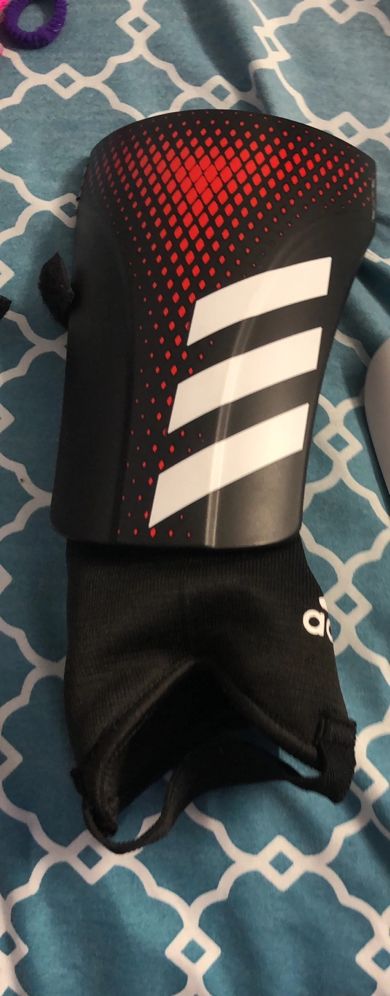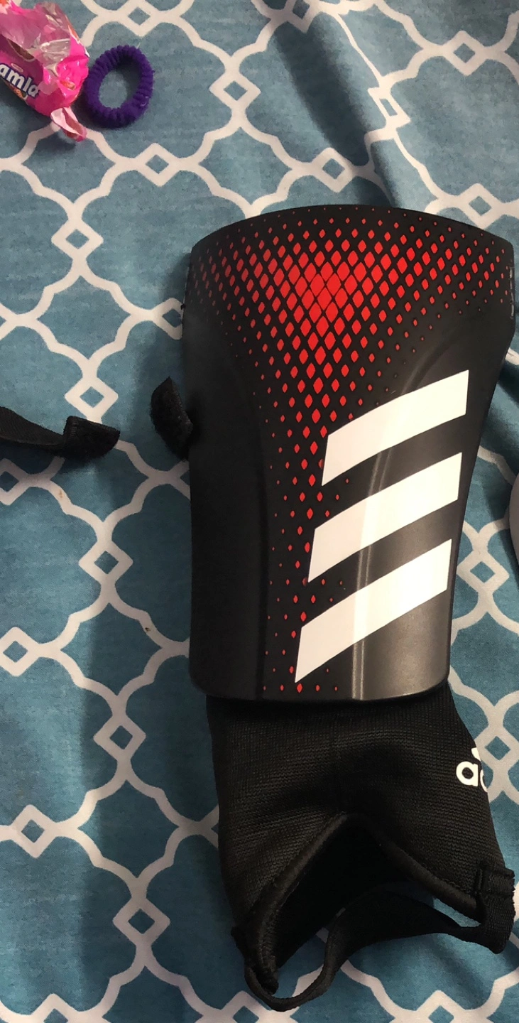 One pair of Adidas soccer shin guards. Black with red and white accents. Good condition.
