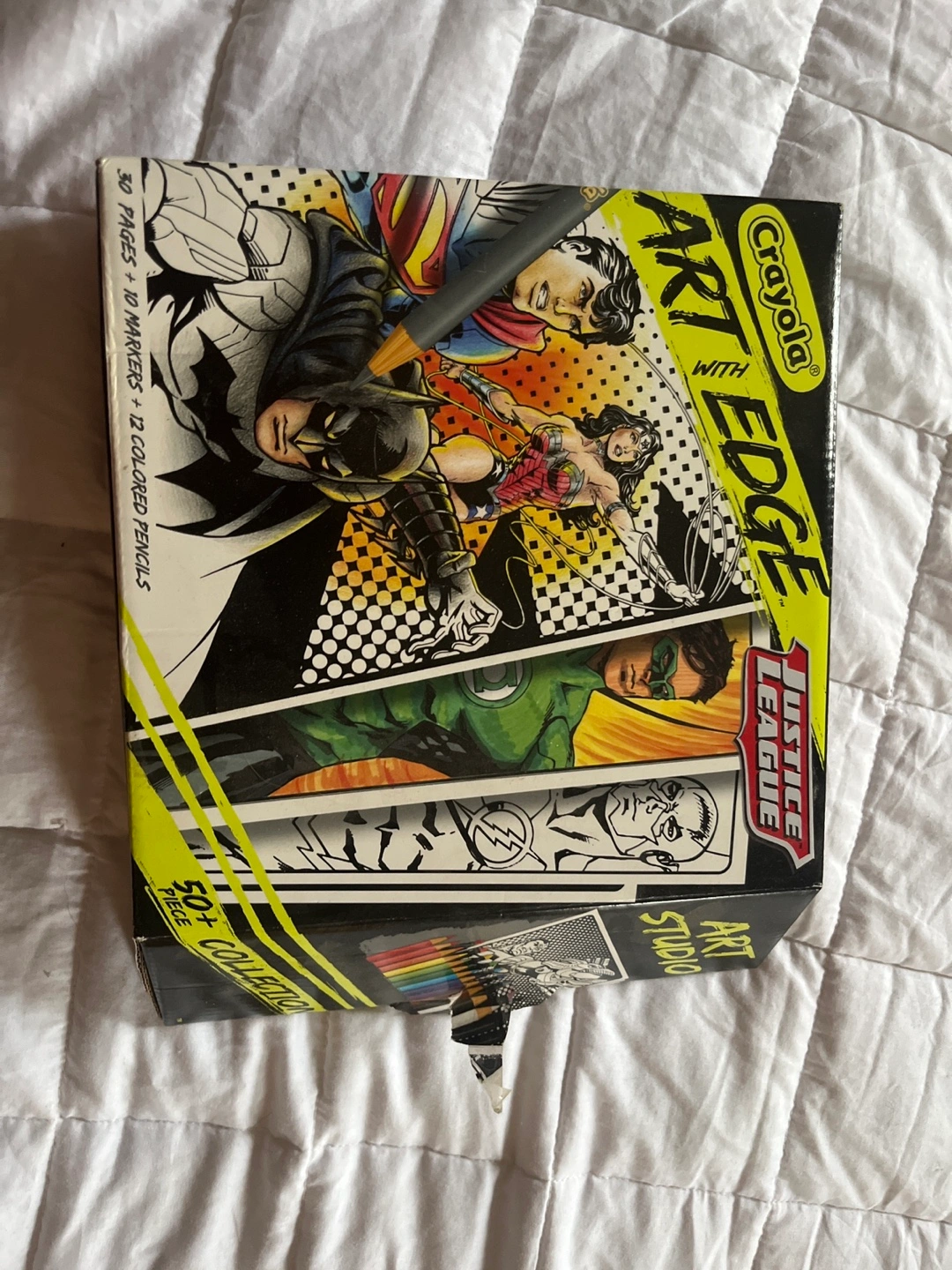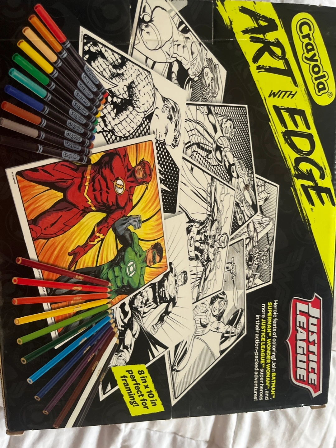 New Justice League colouring book. Includes 12 coloured pencils and markers. 8x10 inch pages, perfect for framing. Great for kids and fans of DC Comics superheroes.