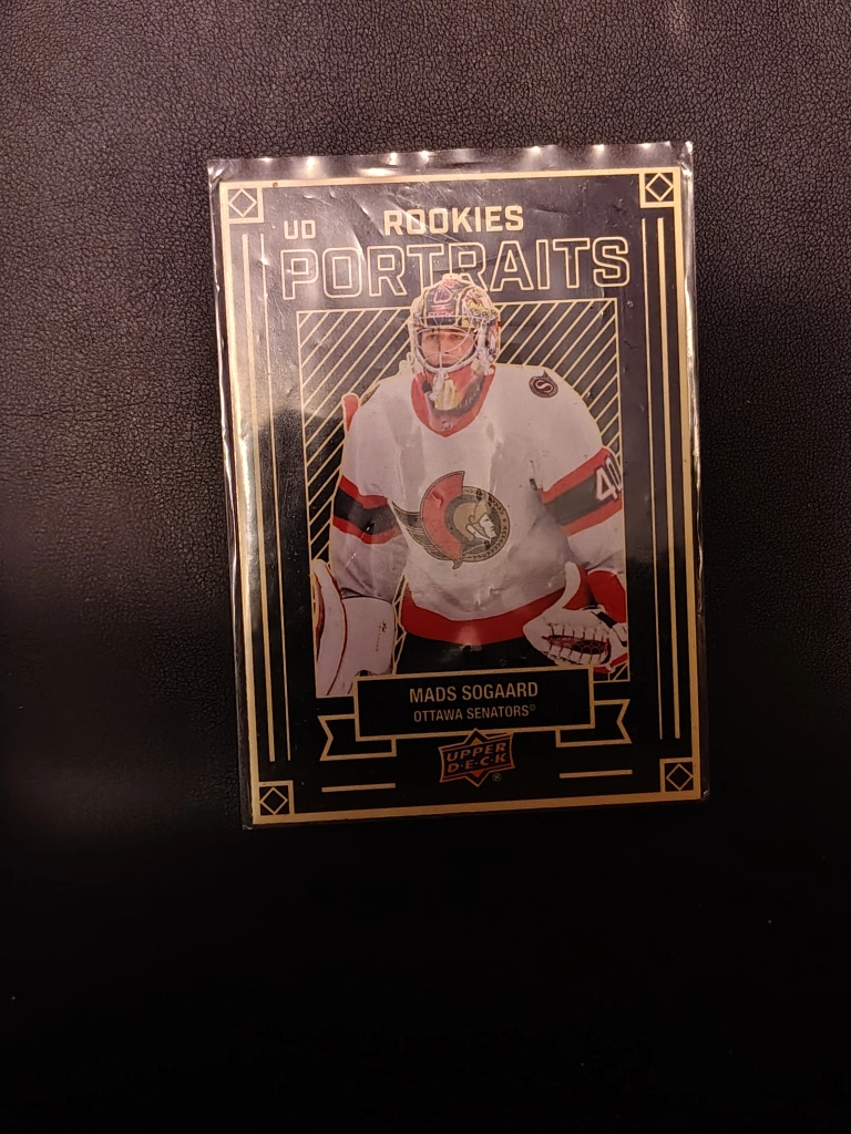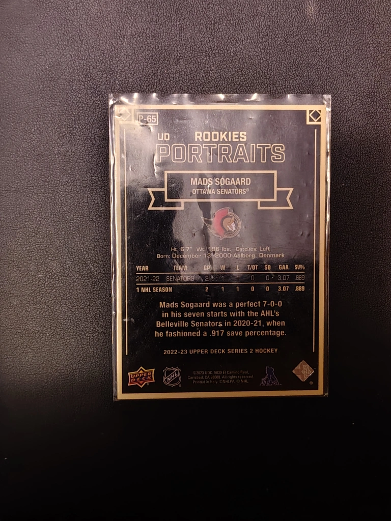 Upper Deck 2022-23 Series 2 Rookie Portraits card. Features Ottawa Senators goalie Mads Sogaard. Excellent condition. Collectible card.