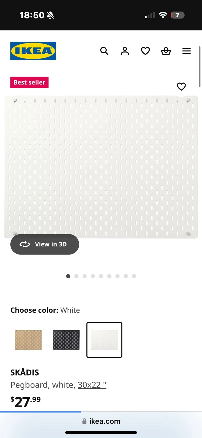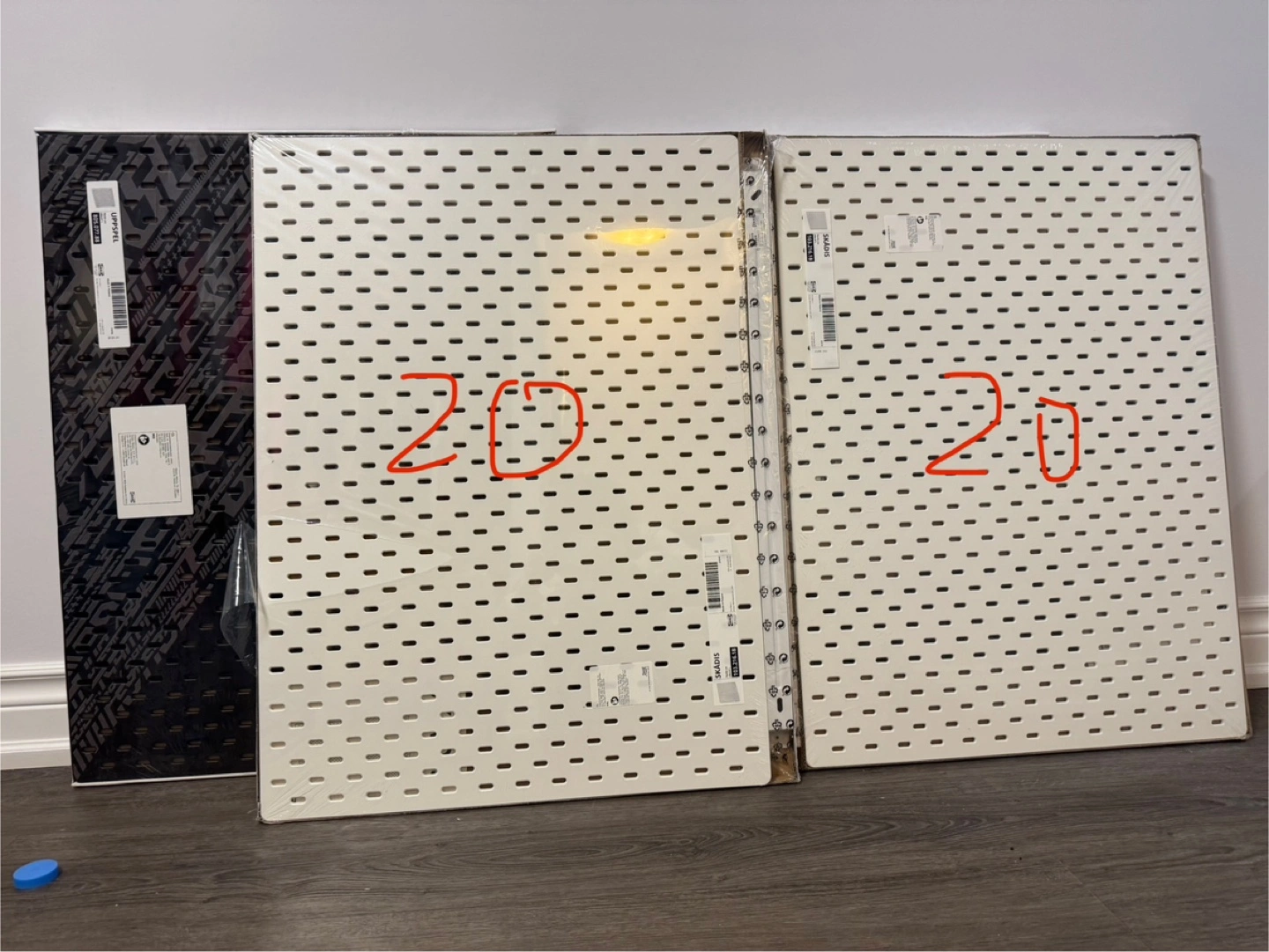 Two white IKEA SKADIS pegboards, 30x22 inches. New in packaging. One black pegboard also available.