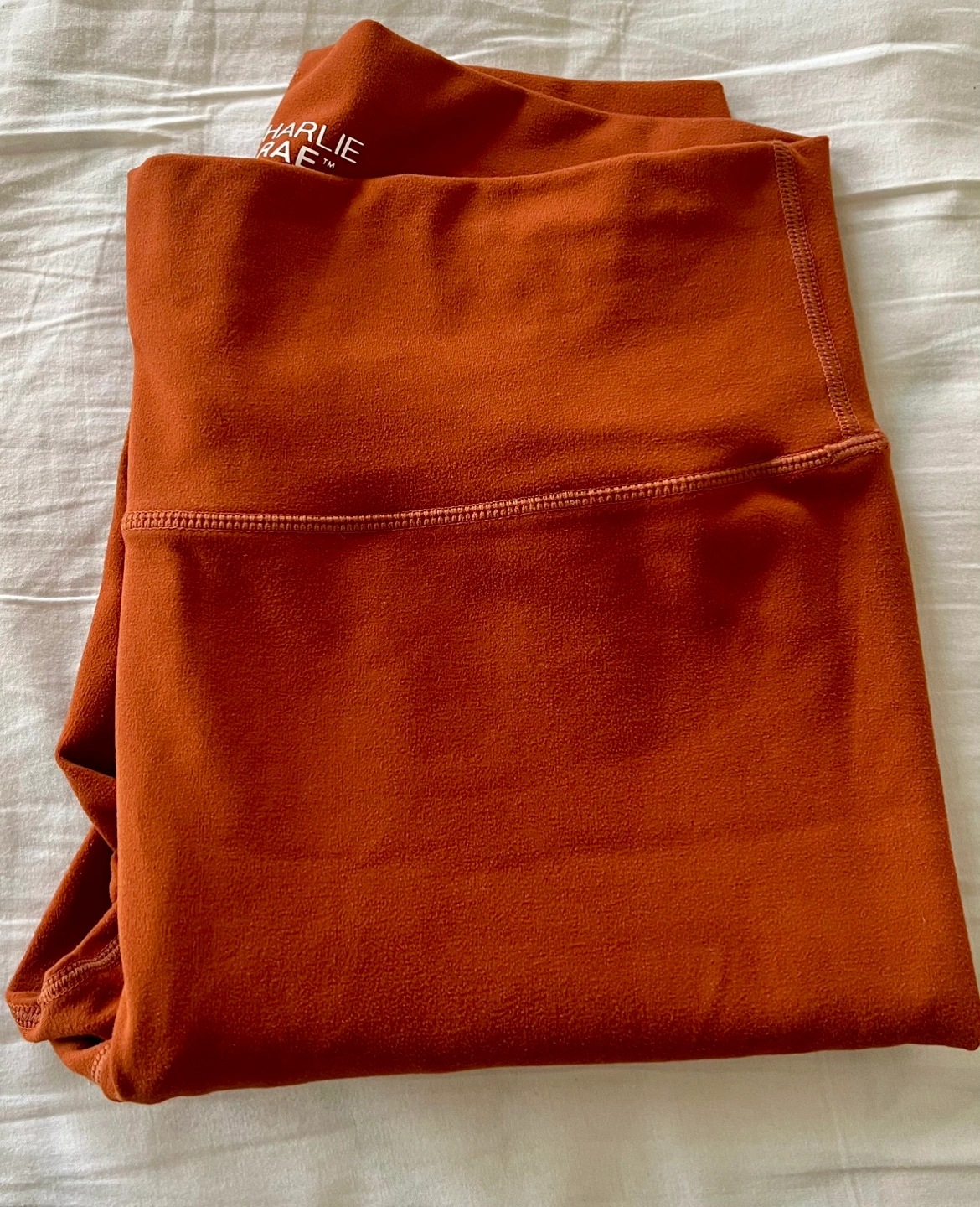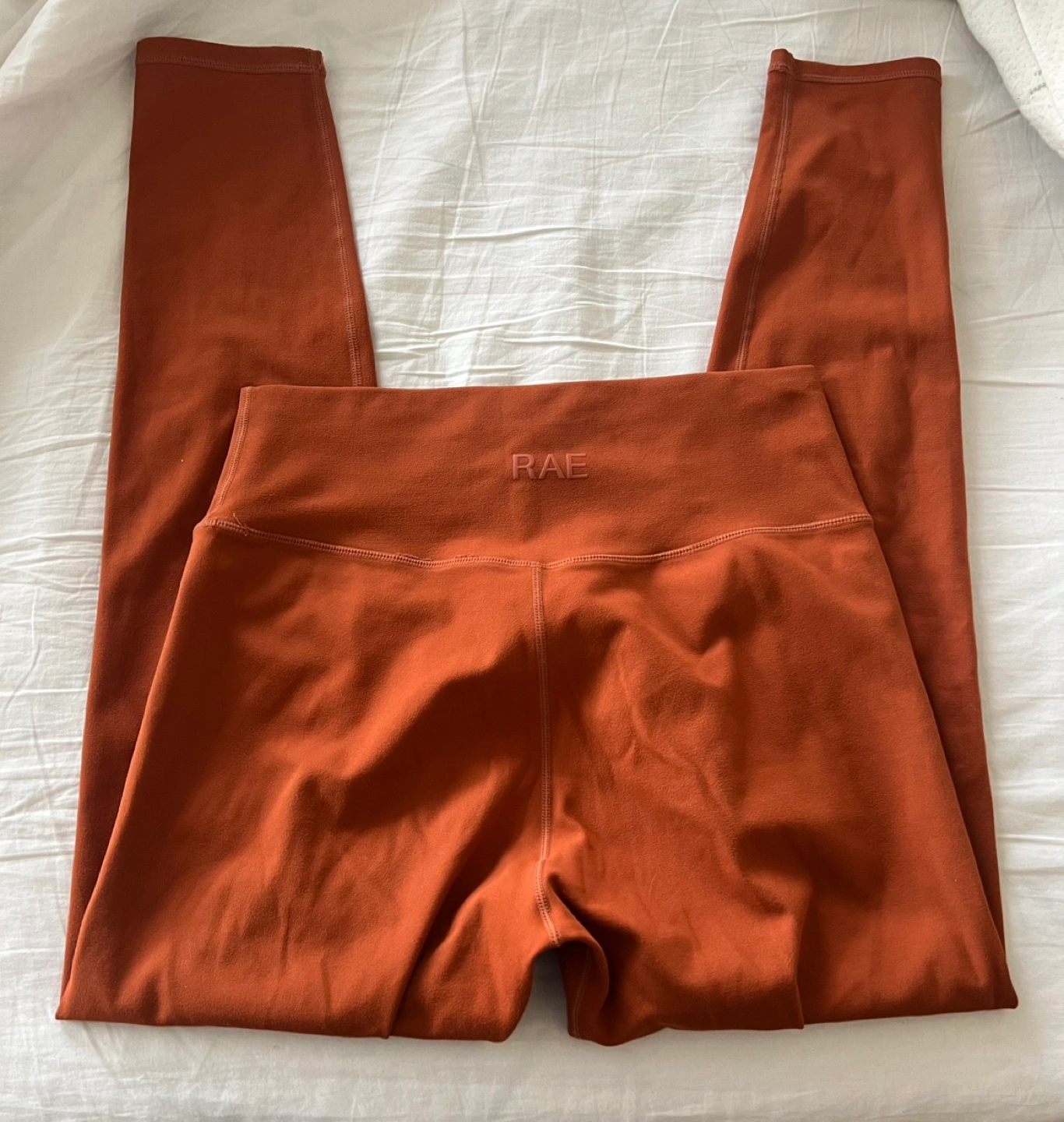 Gorgeous rust-coloured high-waisted leggings Perfect for a workout or lounging 🧘🏻♀️ Great condition - worn once and realized I ordered the wrong size so they don’t fit me sadly Size large - fits 8-10 Lakeshore and parklawn Queen and ossington (some days) Open to trades or $25