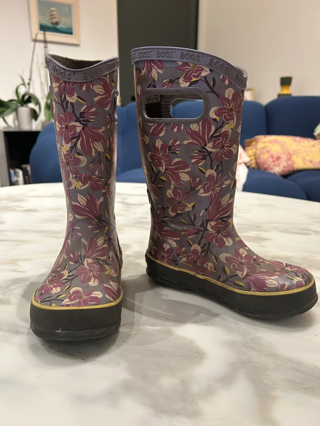 Purple floral print. Great for puddles and rainy days. Size 10 kids. Pick up in the Beaches at Queen and Victoria Park.