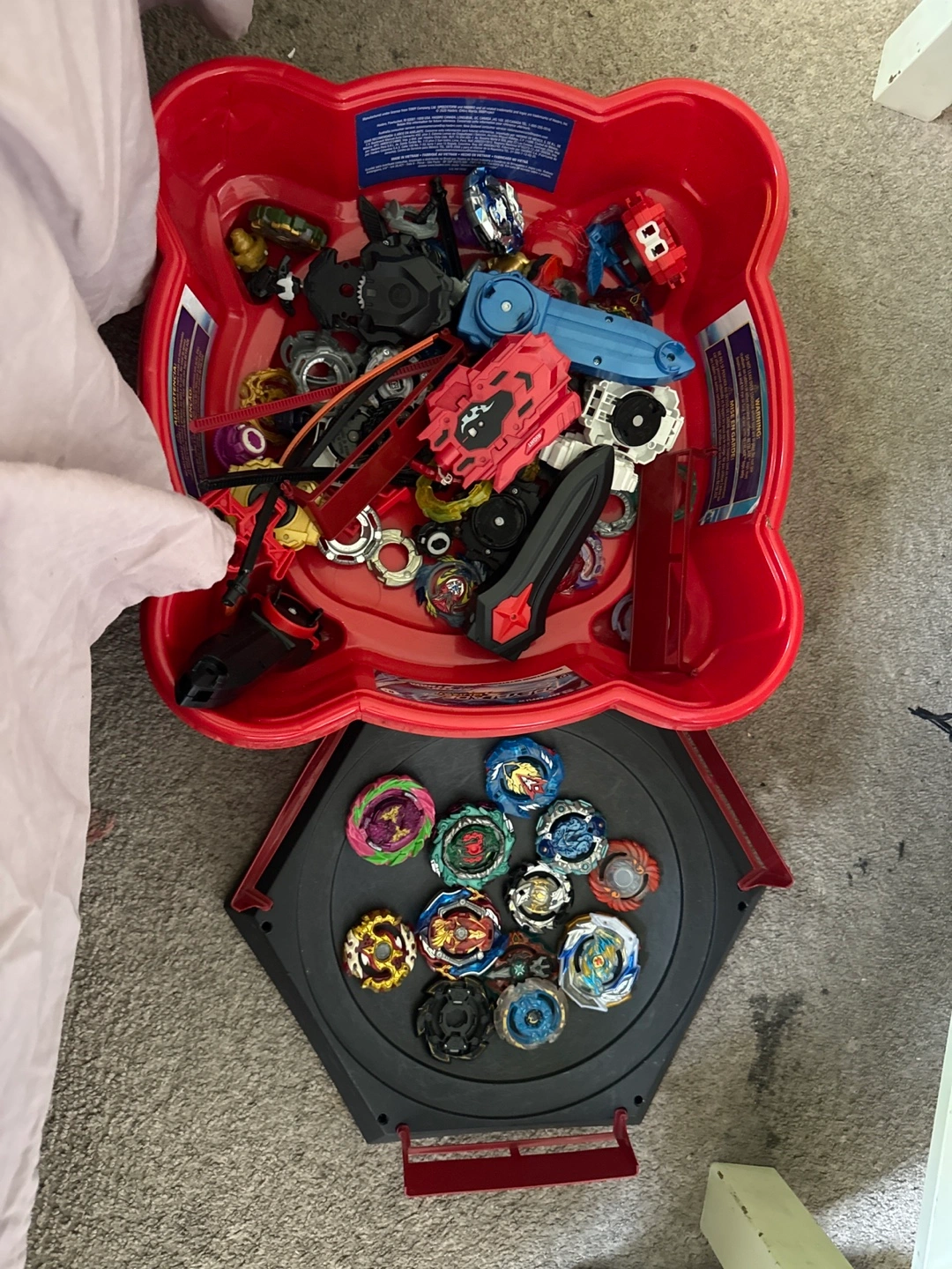 Large lot of Beyblades. Includes multiple tops, launchers, and two Beystadiums. Great for collectors or players. I cannot guarantee that all items are fully intact like the launchers or some tops.