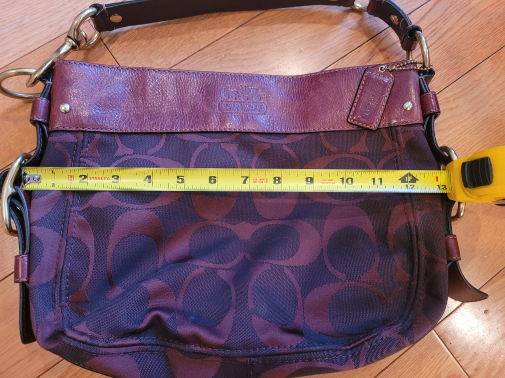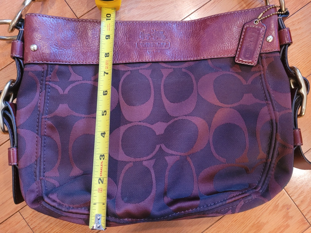 Authentic Coach purse. Red signature C pattern fabric. Leather trim accents. Shoulder strap. Zipper closure. Interior pockets. Measurements approximately 13" wide x 10" tall.