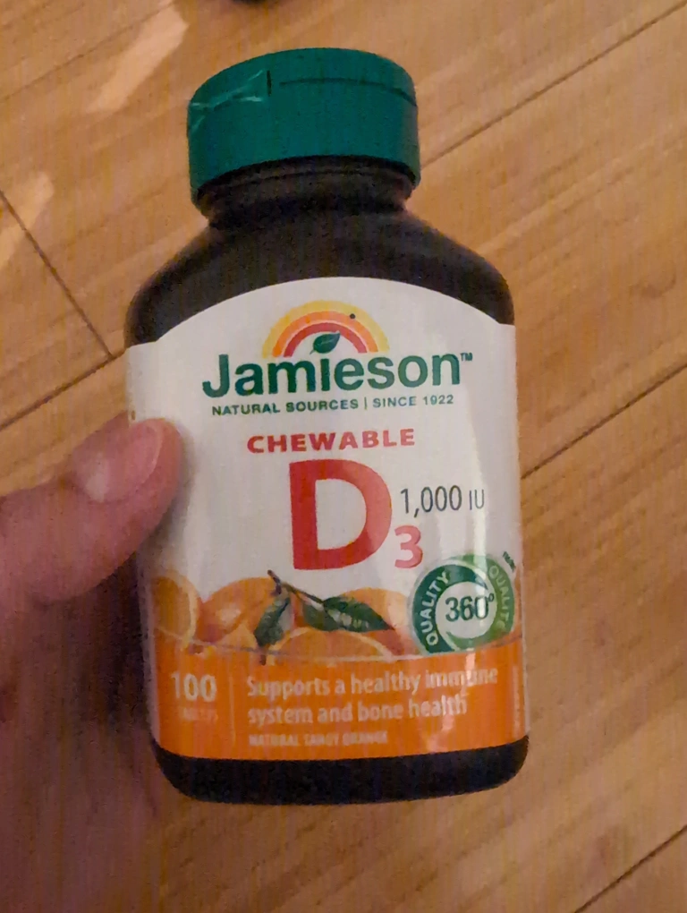 100 chewable Vitamin D3 tablets. 1000 IU per tablet. Supports healthy immune system and bone health. Natural orange flavor. Expiration date October 10, 2026.