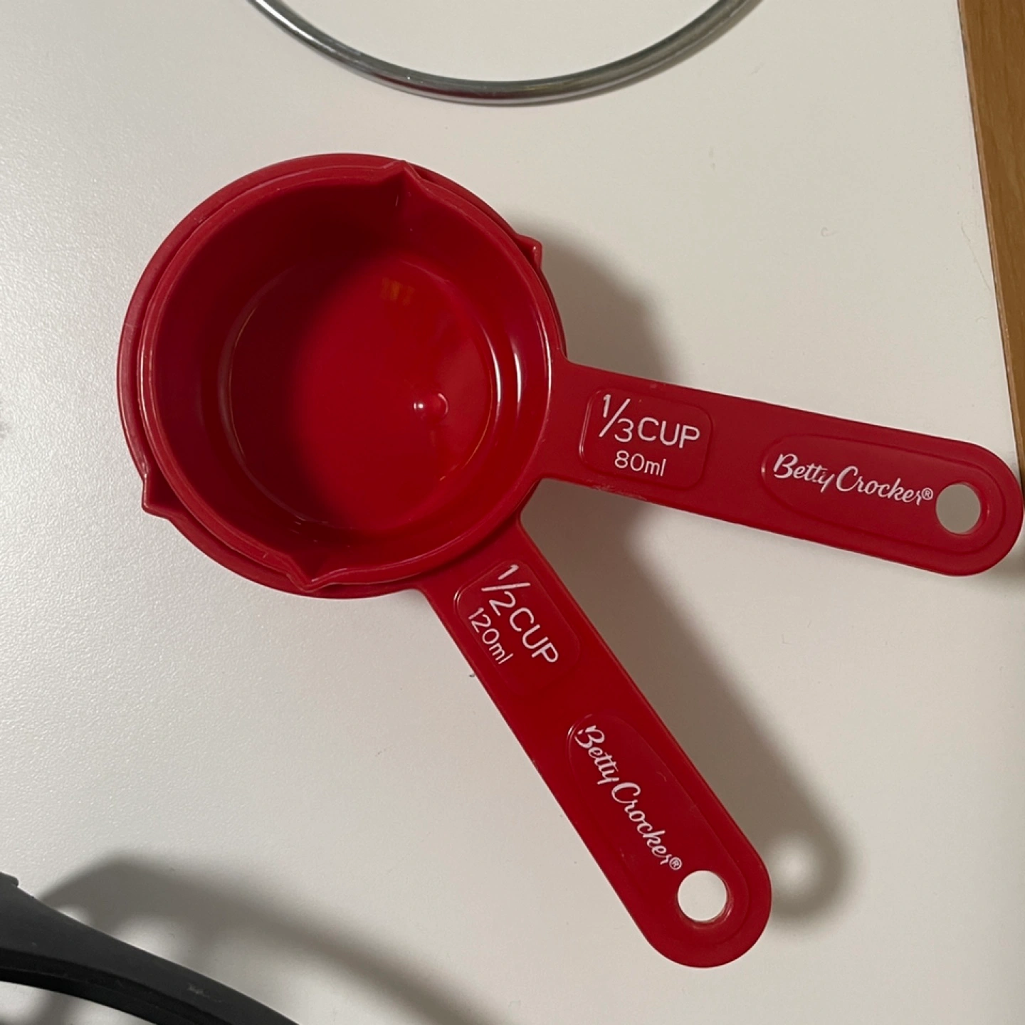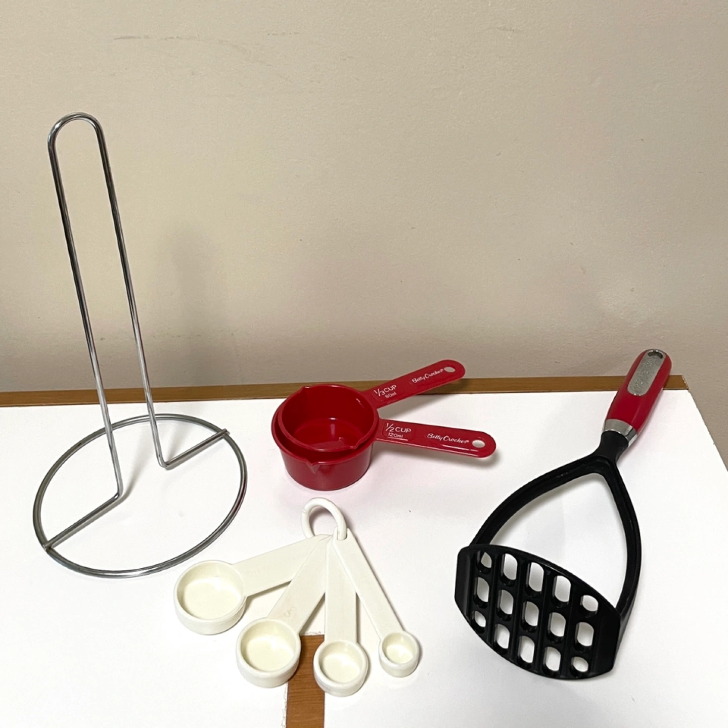 Bundle includes: 2 Betty Crocker measuring cups, Set of 4 white measuring spoons, A potato masher, and chrome paper towel holder. Pre-owned, minor wear but still in great condition. Preferred to sell as a bundle but if you just need individual items, just let me know. Decluttering. More under my listings