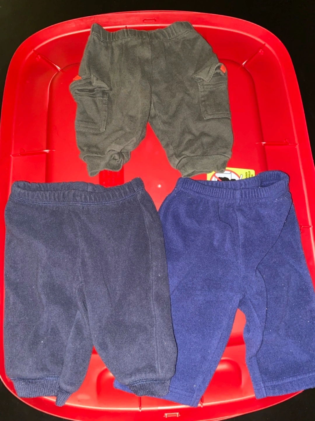 Three pairs of baby boy pants. One pair dark grey cargo pants, one pair navy blue sweatpants, one pair dark blue sweatpants. Size 3 months No delivery No holds As is no refunds