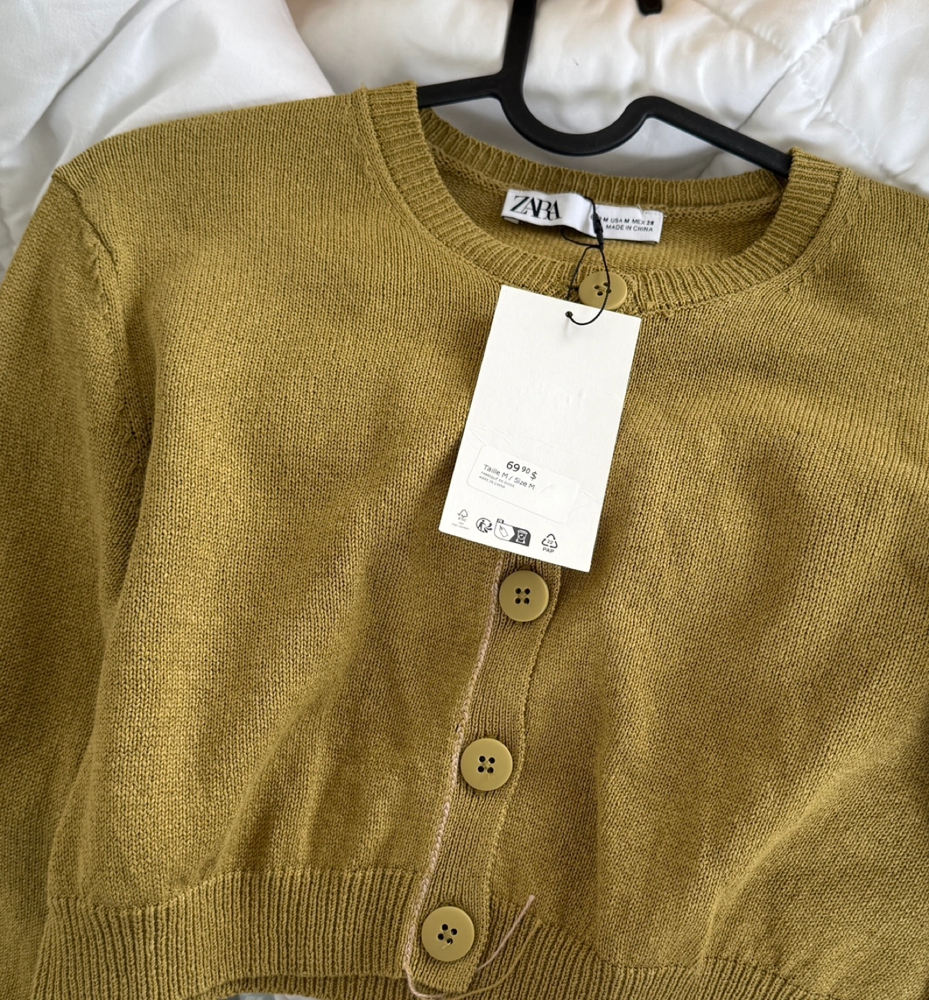 Olive green cropped cardigan. Size medium. Button closure. Long sleeves. New with tag. DT pickup only