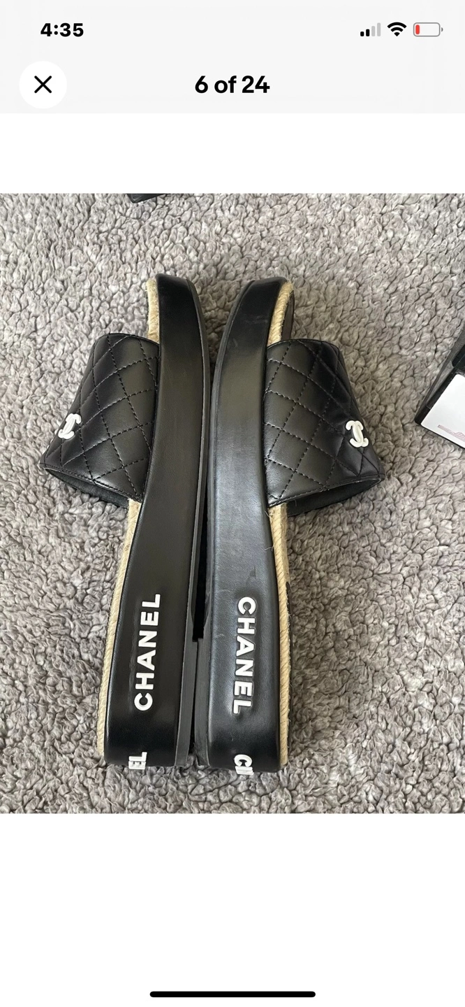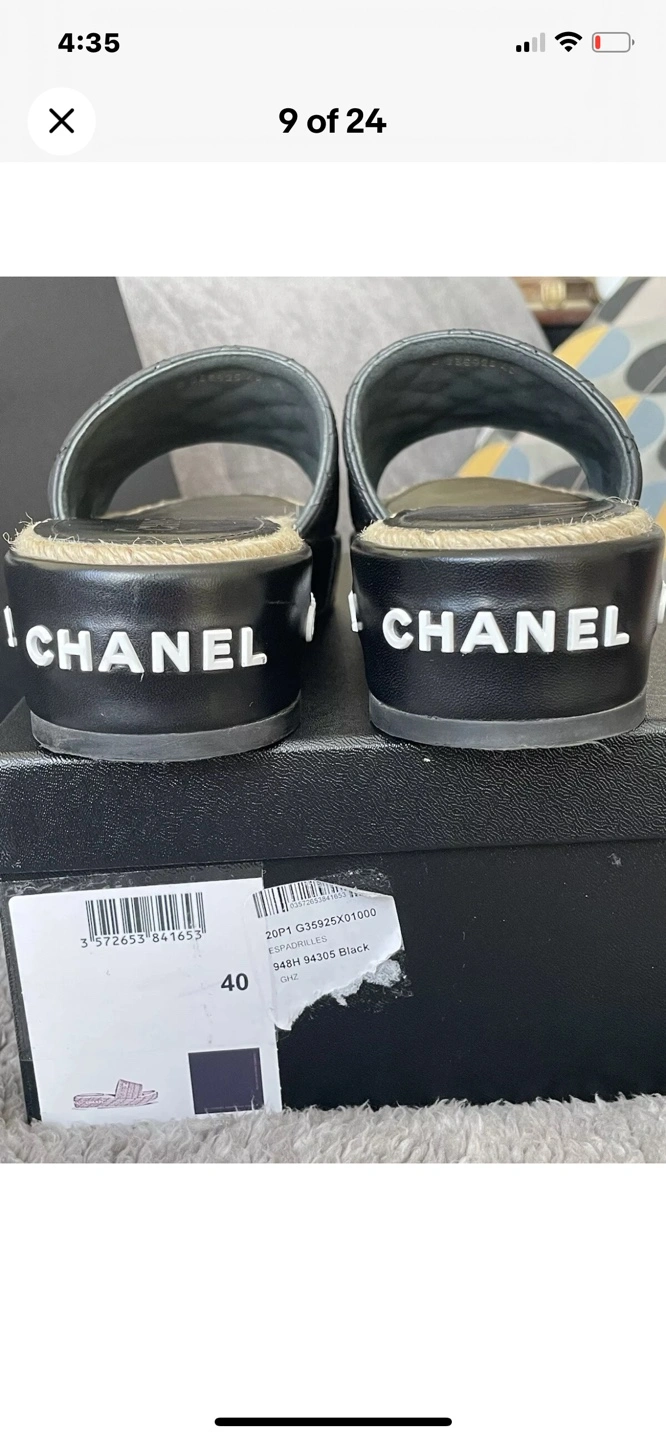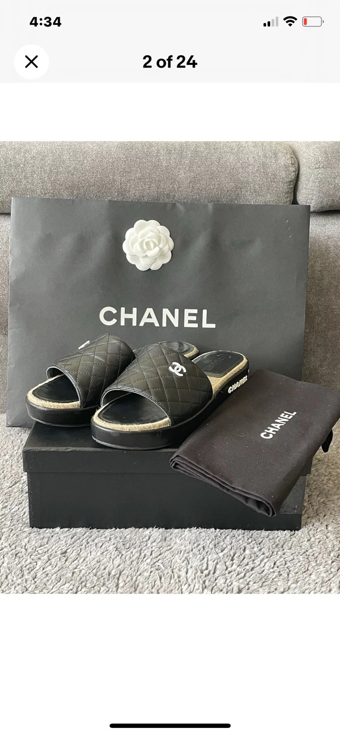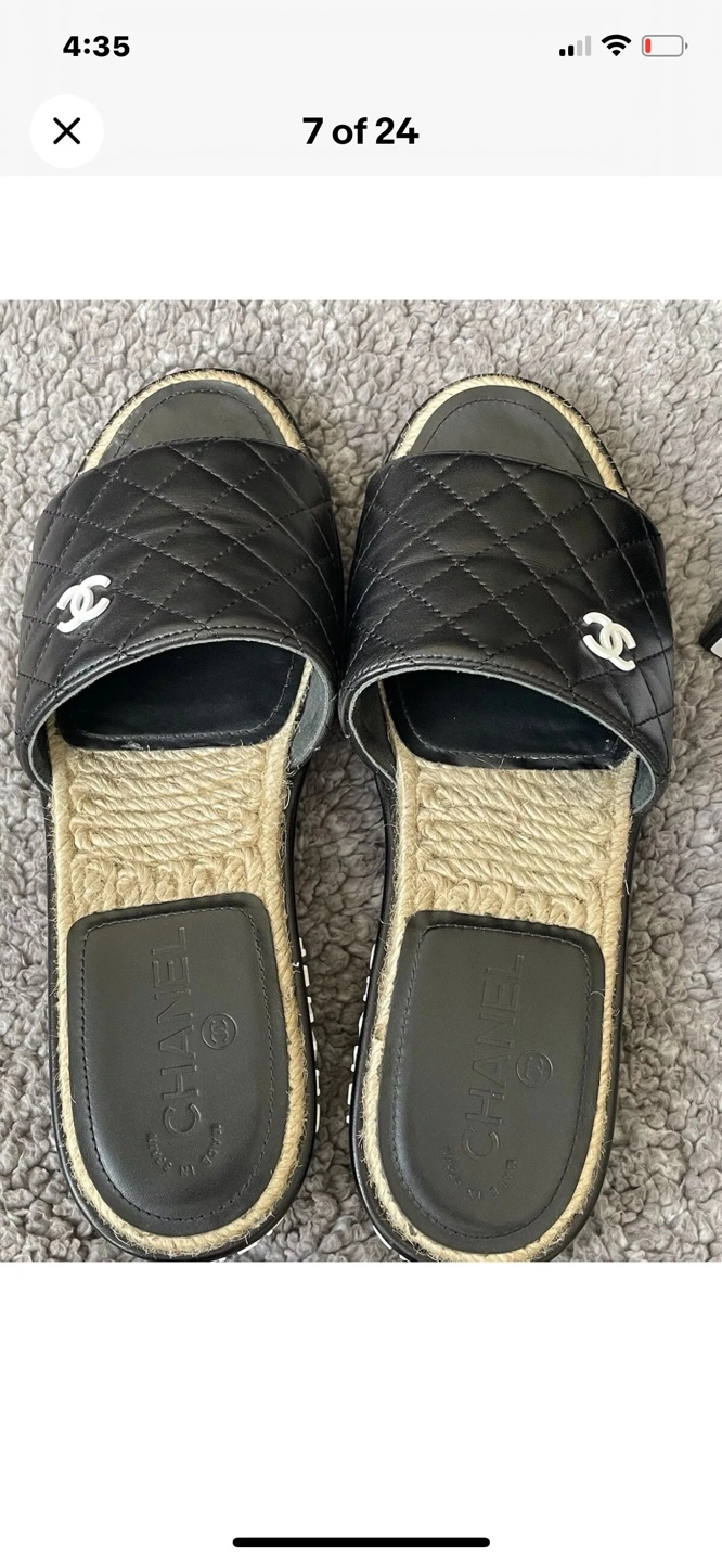 Authentic Chanel slides. Black quilted leather upper. Espadrille sole. Size 40. Includes box and dust bag. Shoes were worn only twice inside the house, they are in very good condition except small nail scratch mark on the side. Selling them because they are too narrow for me or can trade for the same shoes but in size 40 C. ⚠️OFFERS IGNORED AND BLOCKED - FIRM PRICE⚠️ Can’t go any lower than $750⚠️ Pick Up Only !!