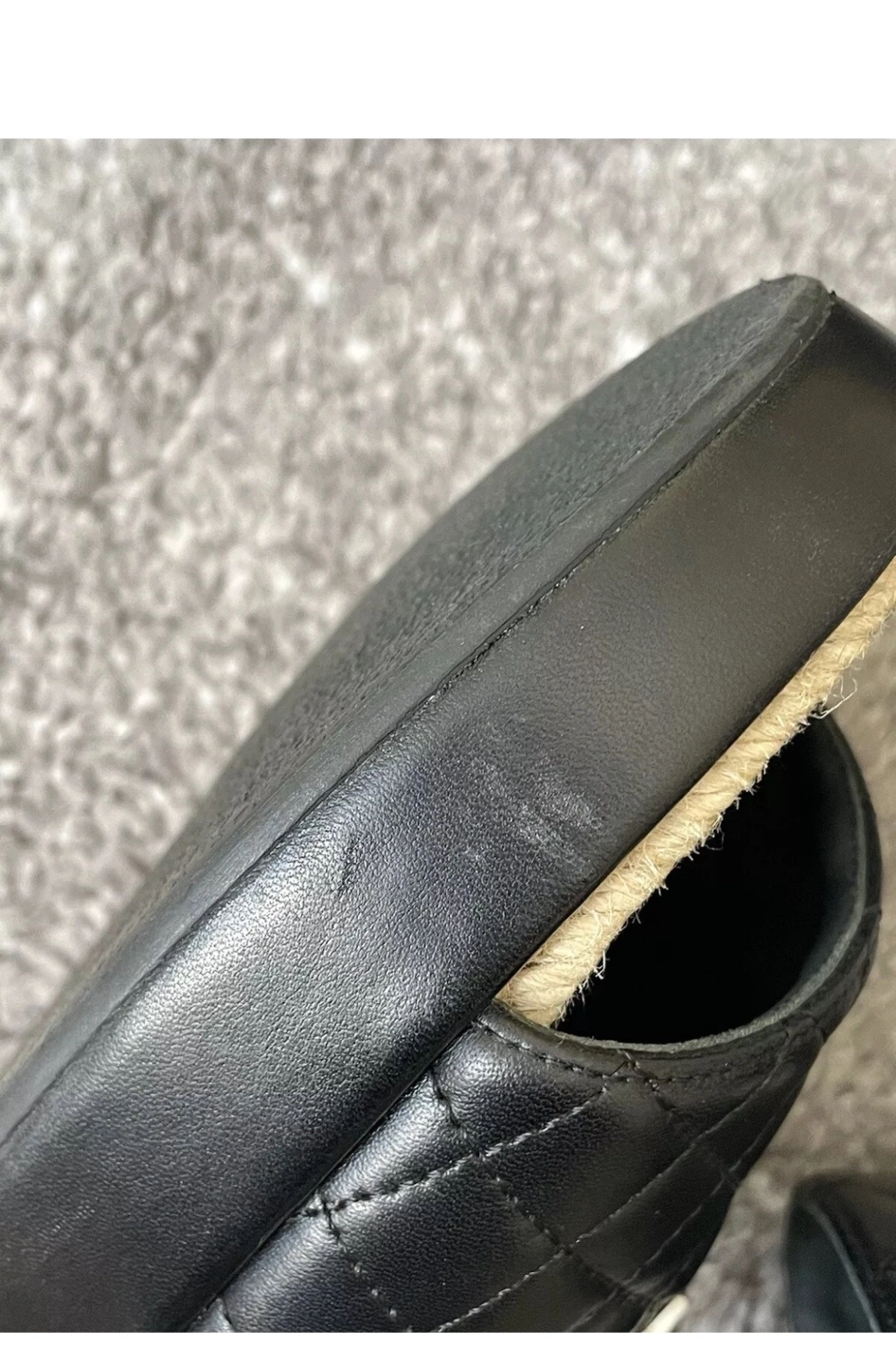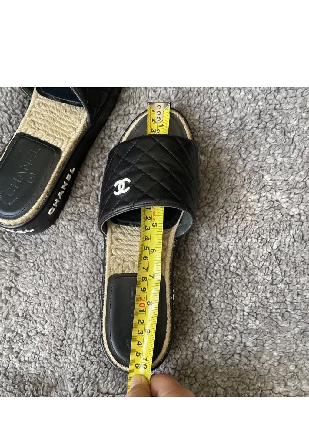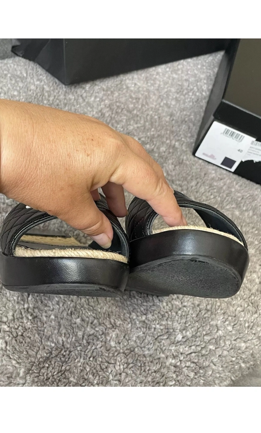 Authentic Chanel slides. Black quilted leather upper. Espadrille sole. Size 40. Includes box and dust bag. Shoes were worn only twice inside the house, they are in very good condition except small nail scratch mark on the side. Selling them because they are too narrow for me or can trade for the same shoes but in size 40 C. ⚠️OFFERS IGNORED AND BLOCKED - FIRM PRICE⚠️ Can’t go any lower than $750⚠️ Pick Up Only !!