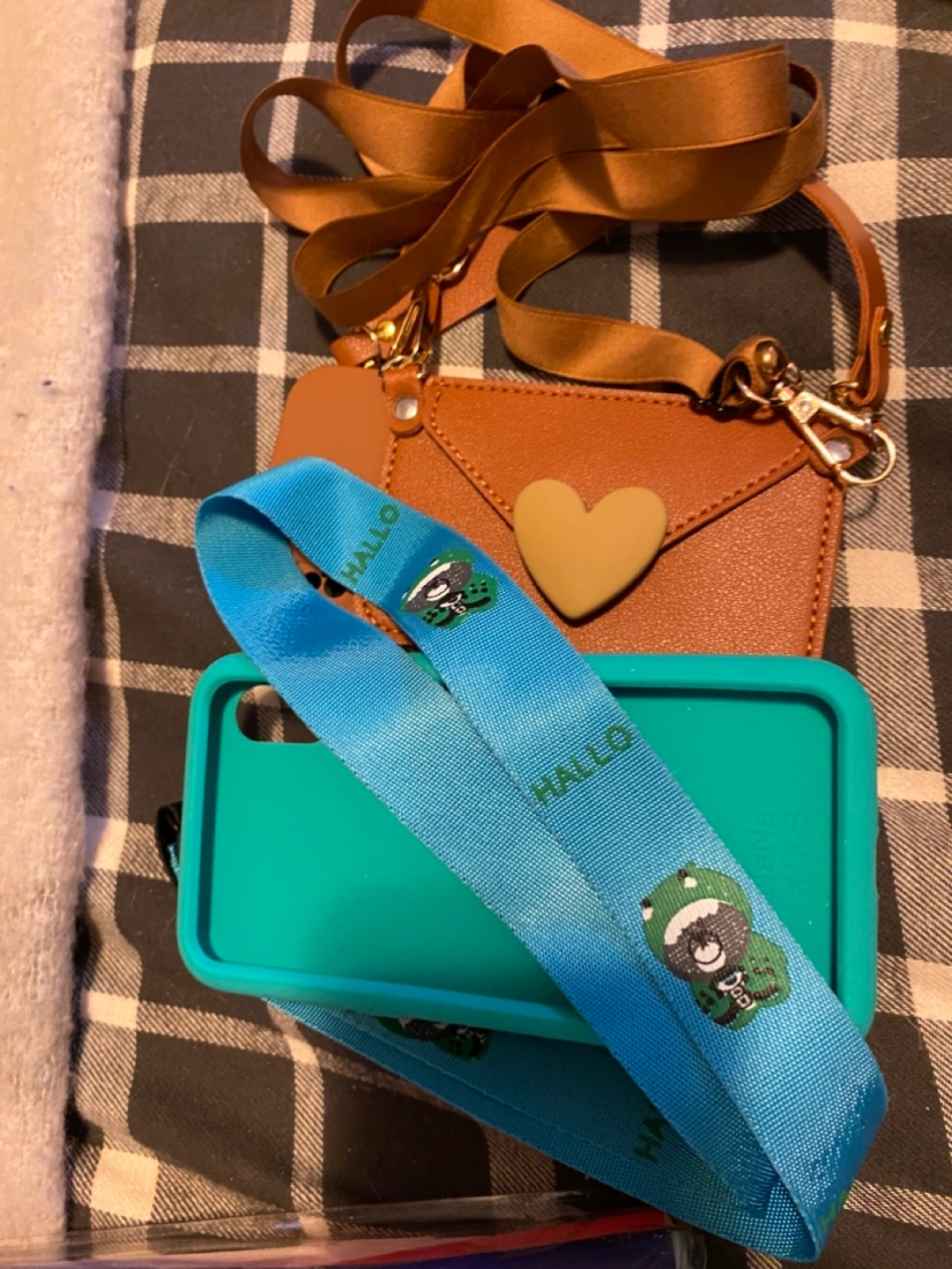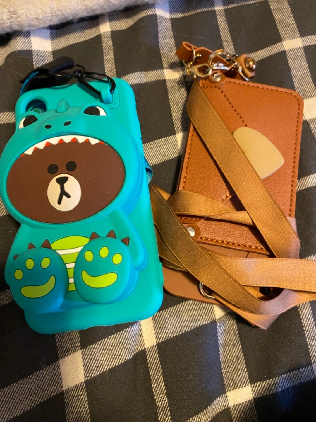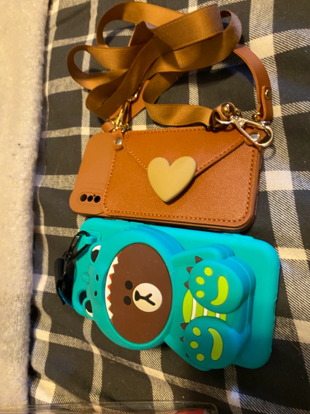 Two-piece set. Brown leather-like card holder with heart detail and adjustable strap. Teal silicone phone case featuring a cartoon dinosaur design. Matching lanyards included. Great for carrying essentials. Both for $5
