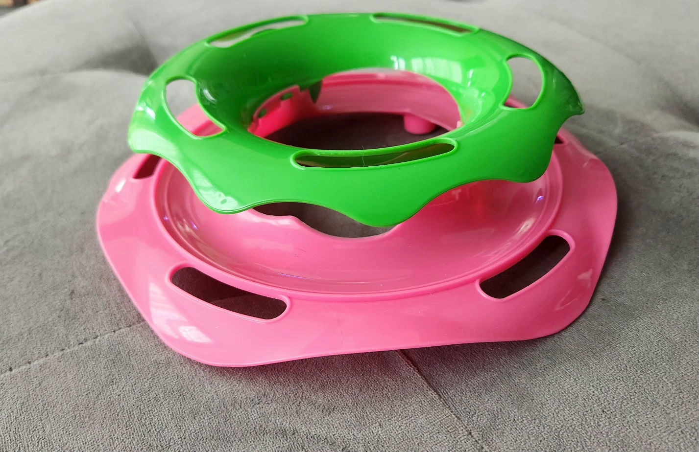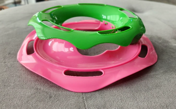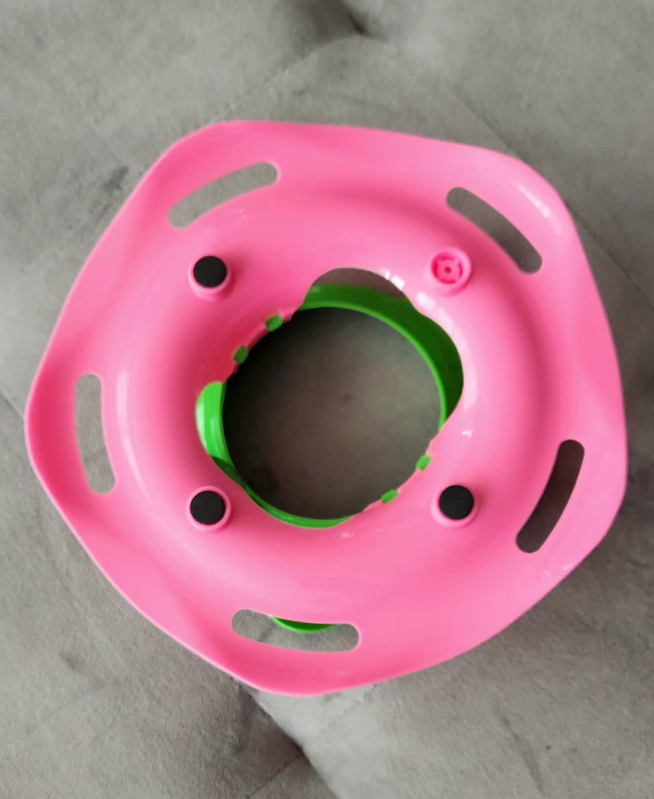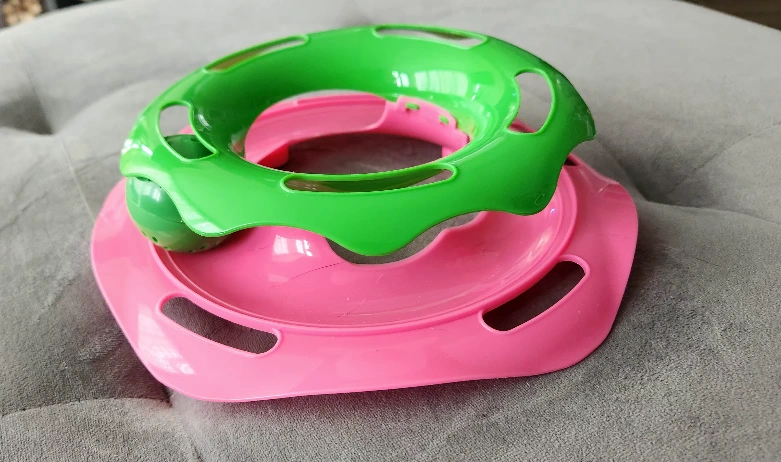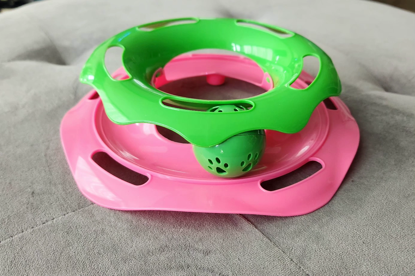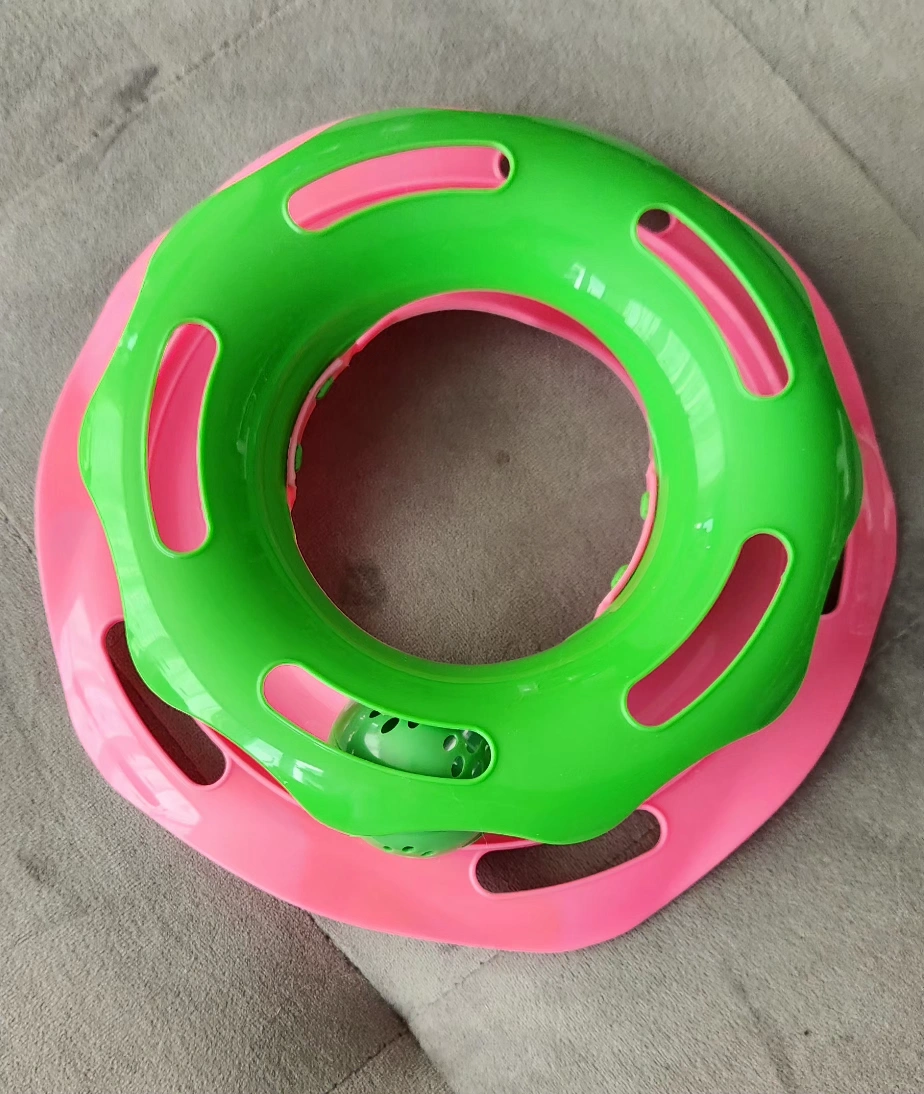 Fun pink and green plastic cat toy. Features a rolling ball for interactive play. Spinning balls kept cat busy and entertained. Stimulates your cat’s senses and hunting instincts. Non-skid pads at bottom holds the toy in place. Never been used.