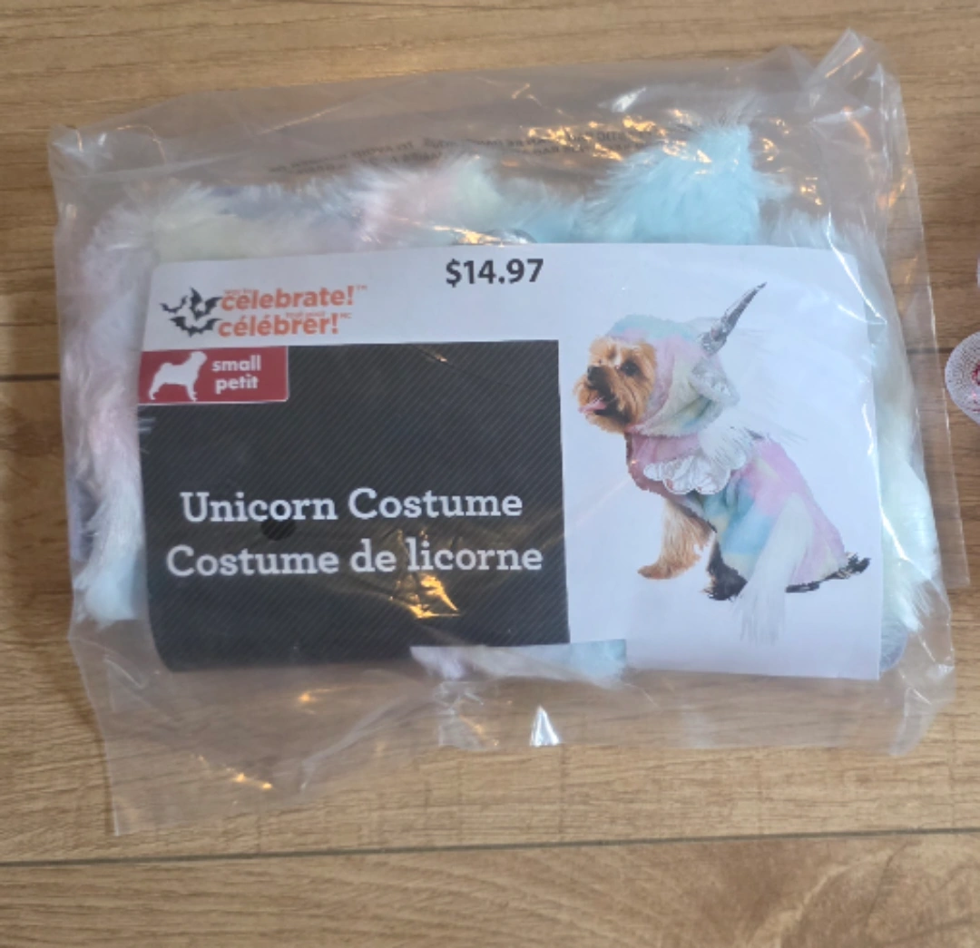 New, in package. Pastel colours. Size small. Features a hooded unicorn design with wings.