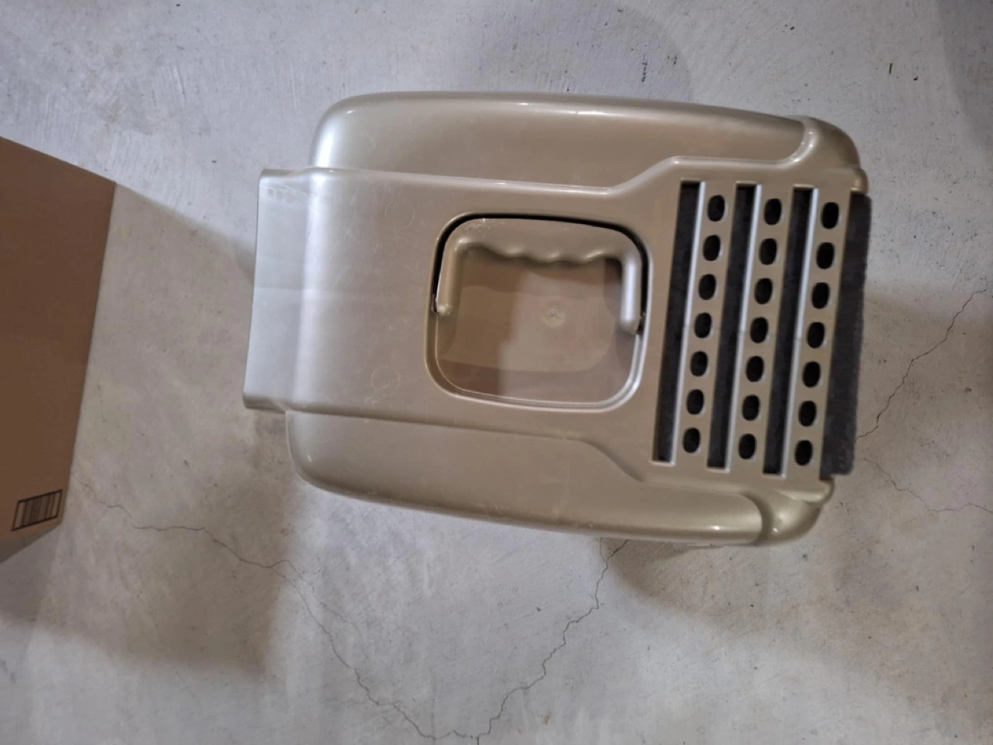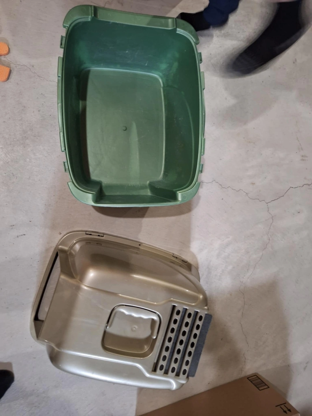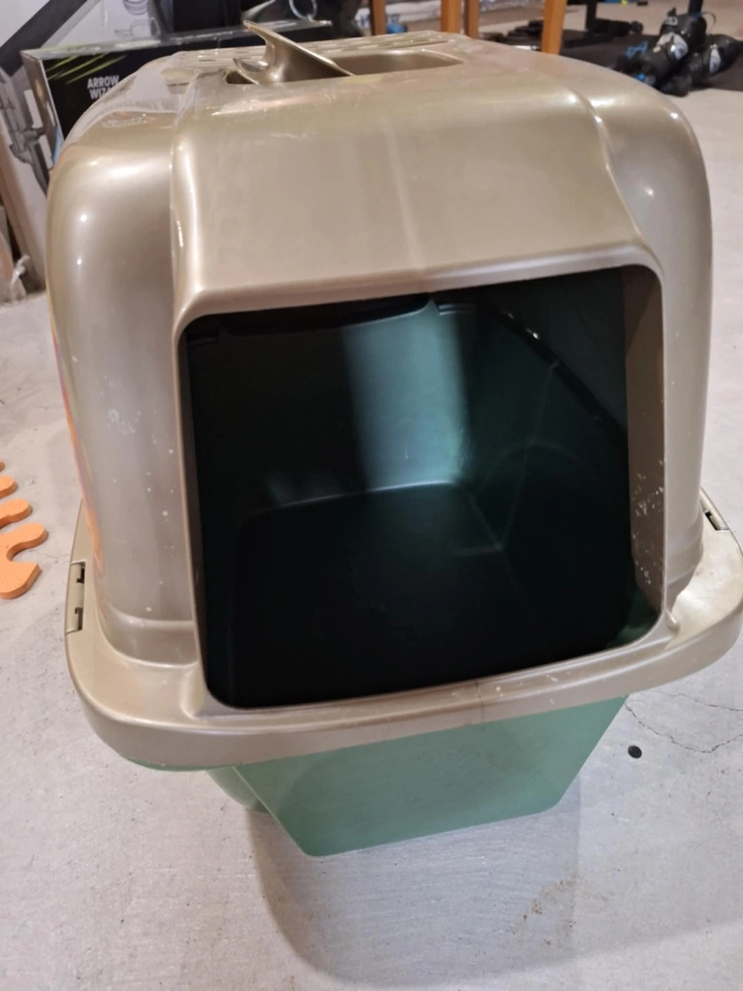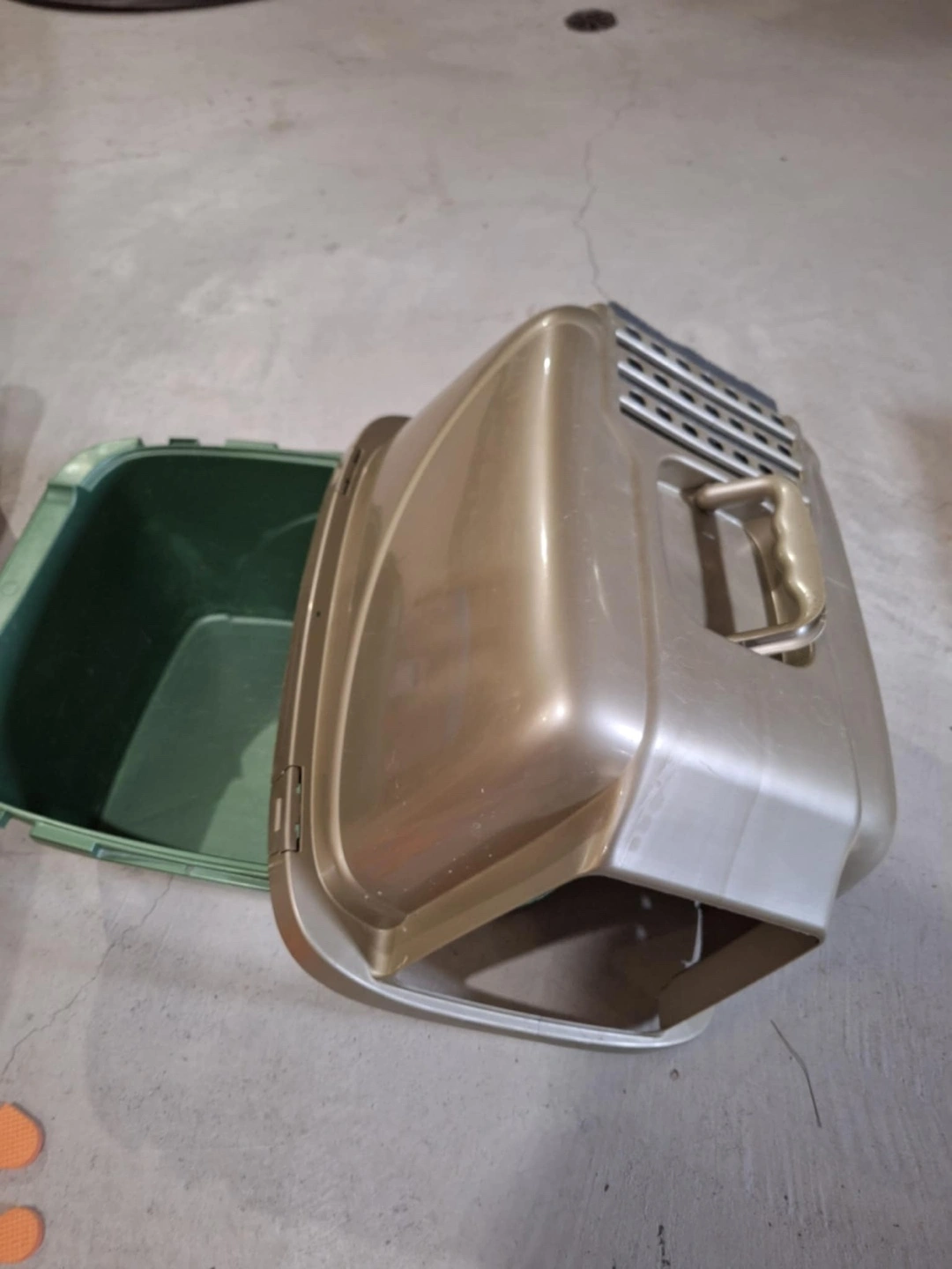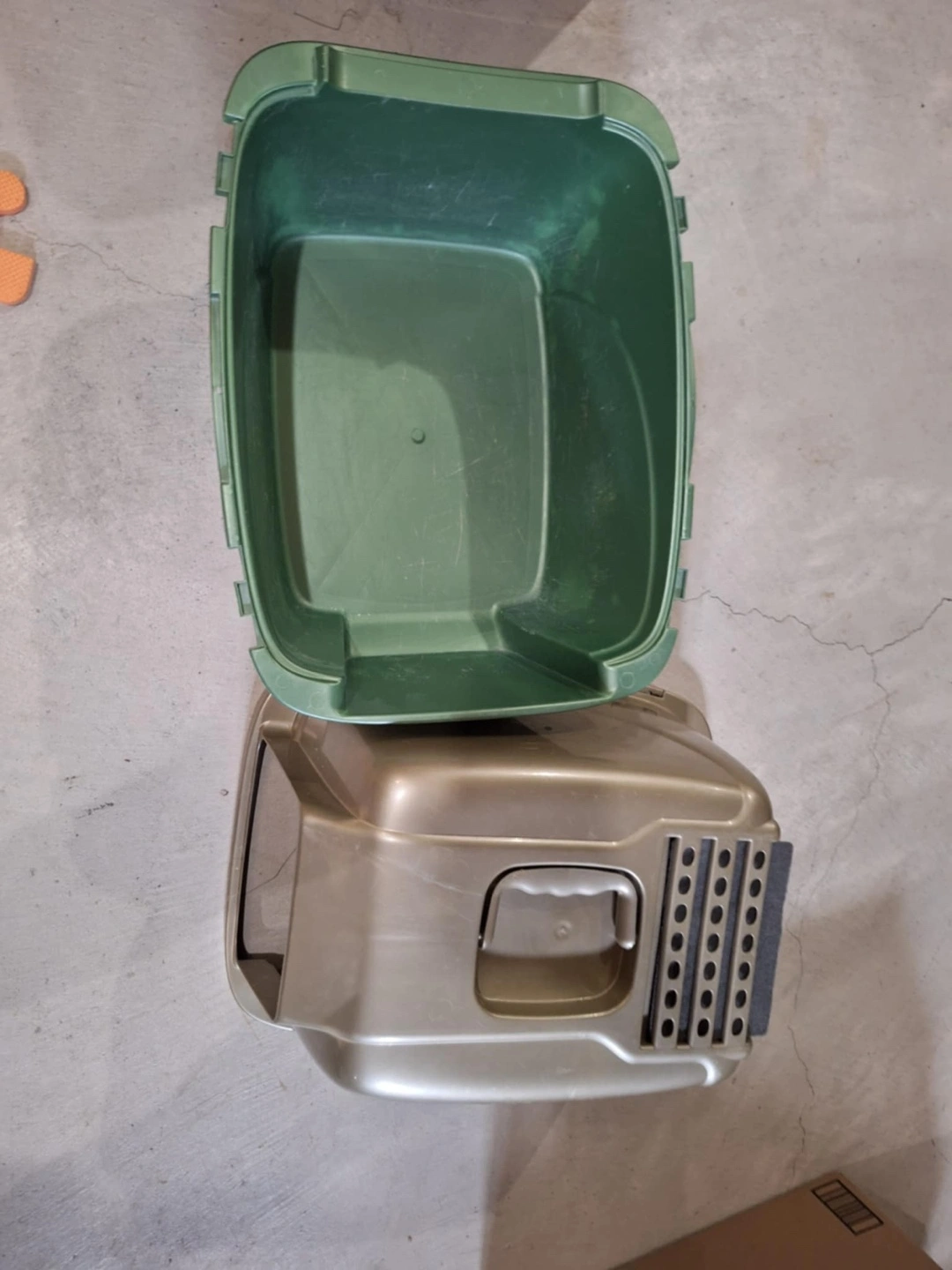 Used cat litter box. Clean and ready for pick up. Two-piece design. Green base and beige top. Front flap missing. Features a carrying handle.