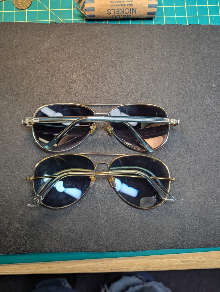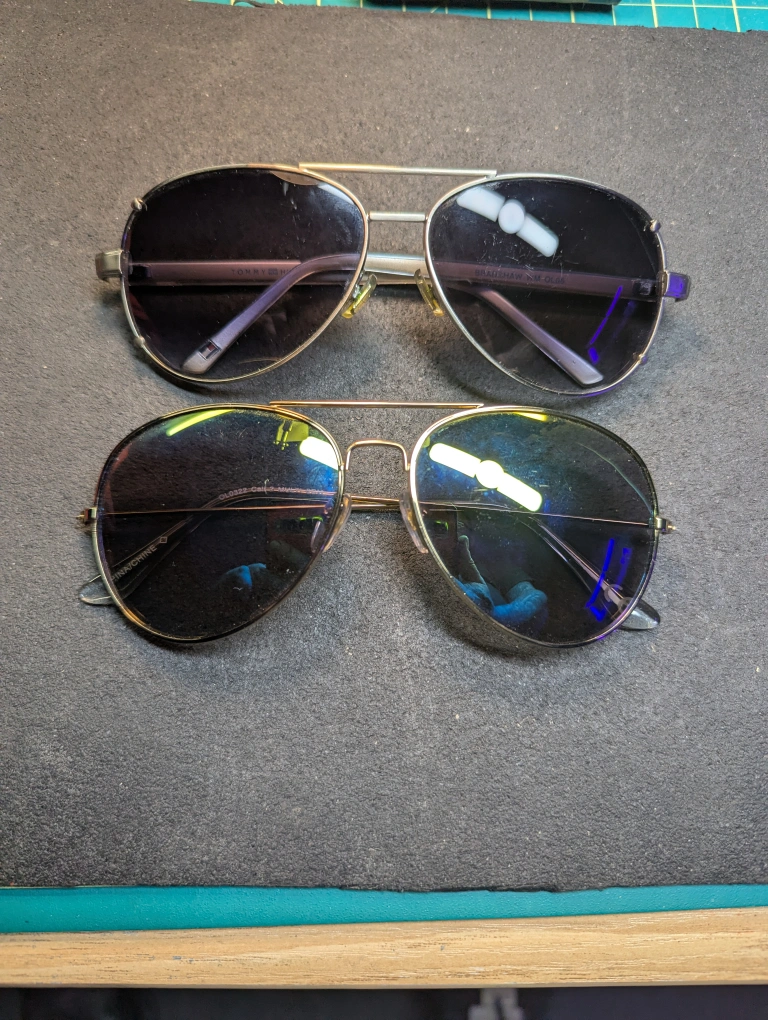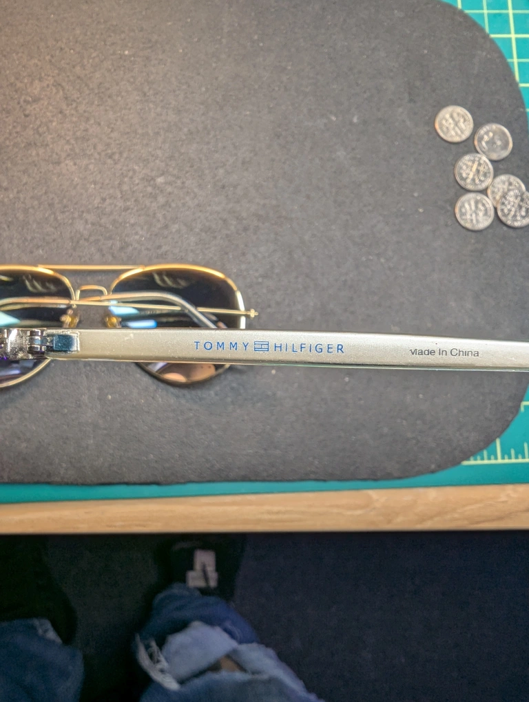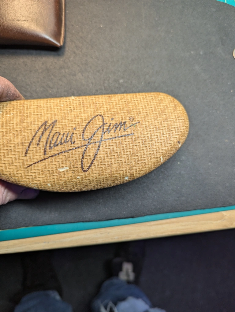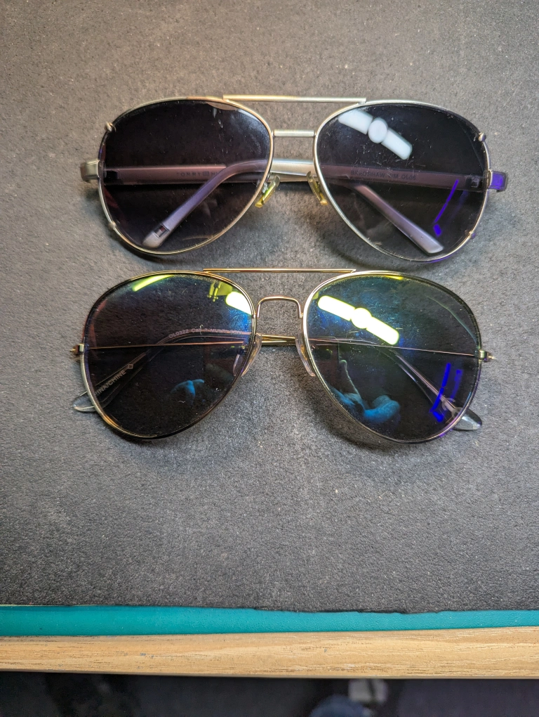 Pair of aviator sunglasses,one is Tommy Hilfiger and the other is unknown, but is still of good quality. both have Gold frames with brown and greenish lenses. Includes vintage Ray-Ban and Maui Jim cases. Leather and rattan like exterior. they have some wear. $20 for both pairs, pick up in port hope
