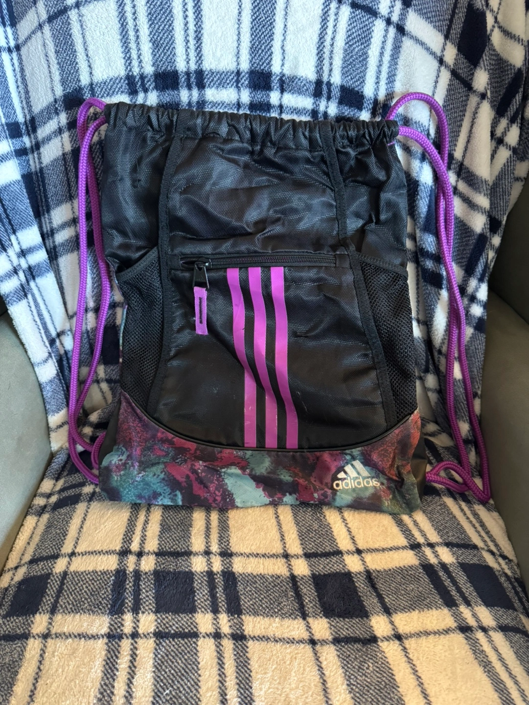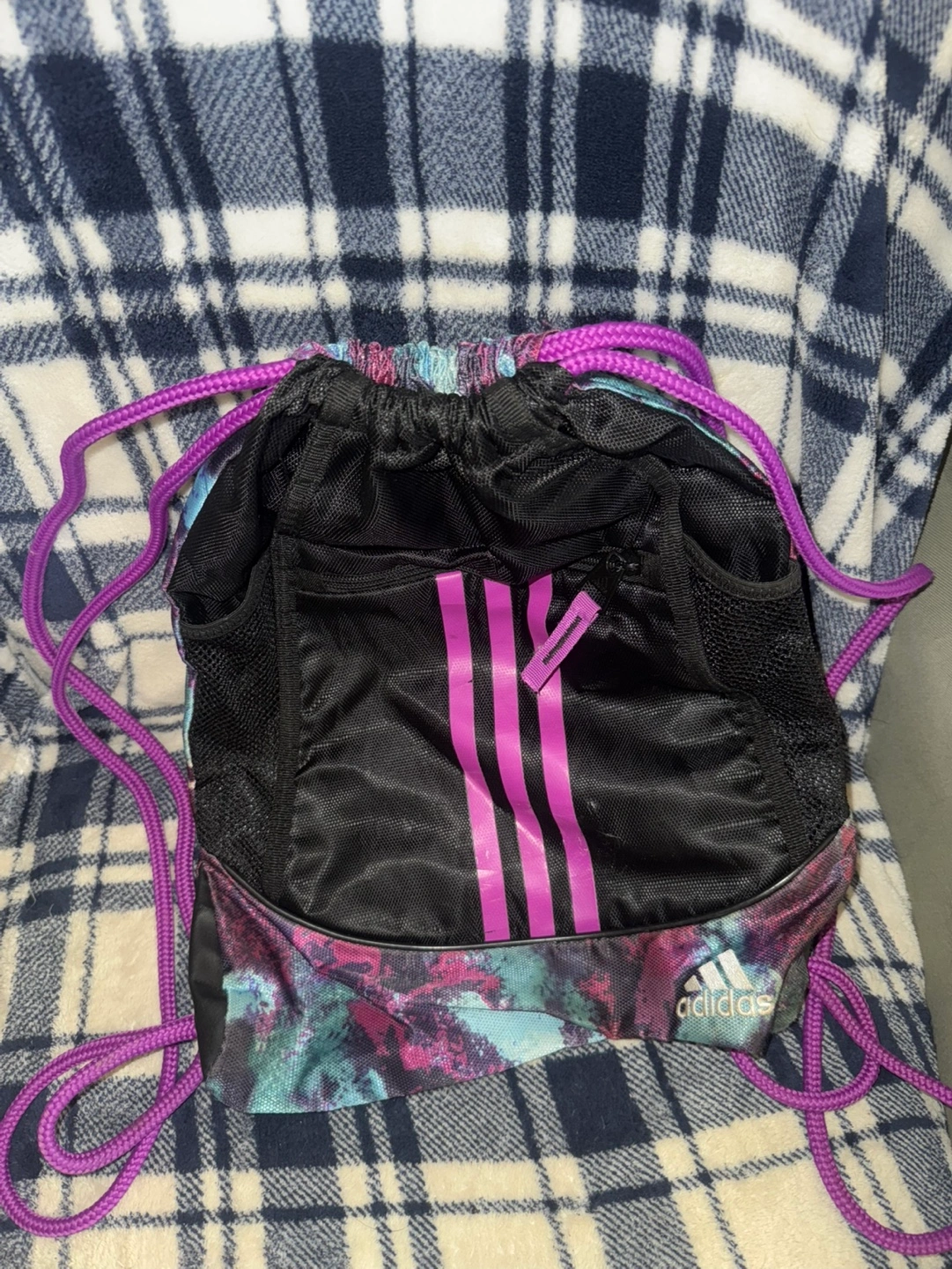 Adidas drawstring bag. Purple drawstring cords. Black main compartment with mesh shoe pockets. Small zippered pocket. Galaxy-style print. Great for gym, sports, or travel.