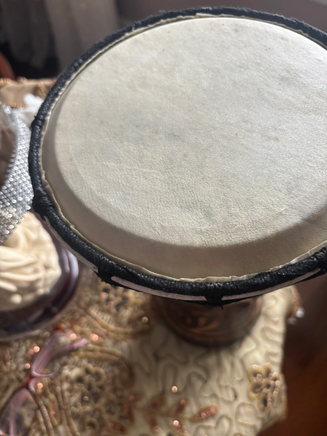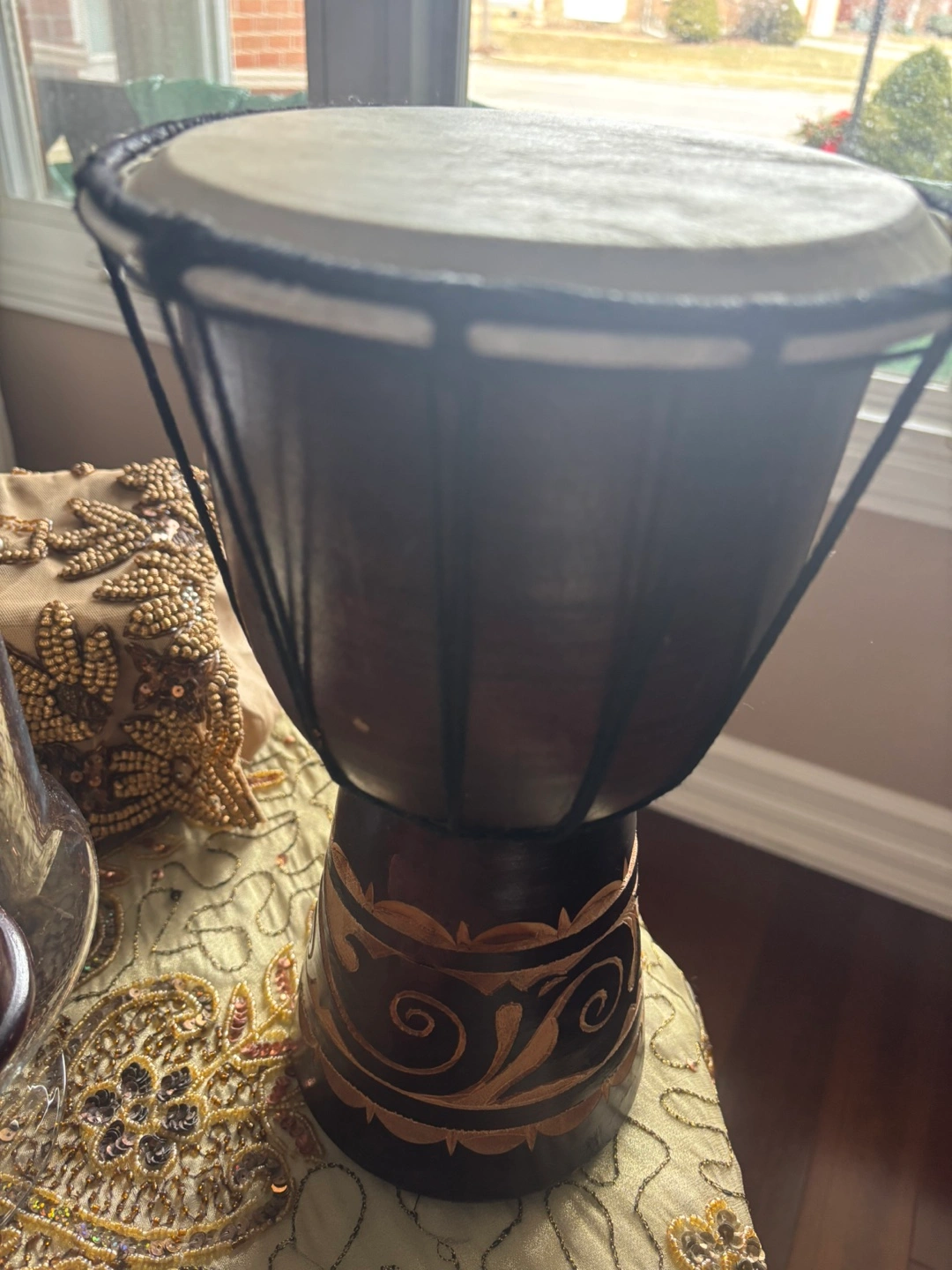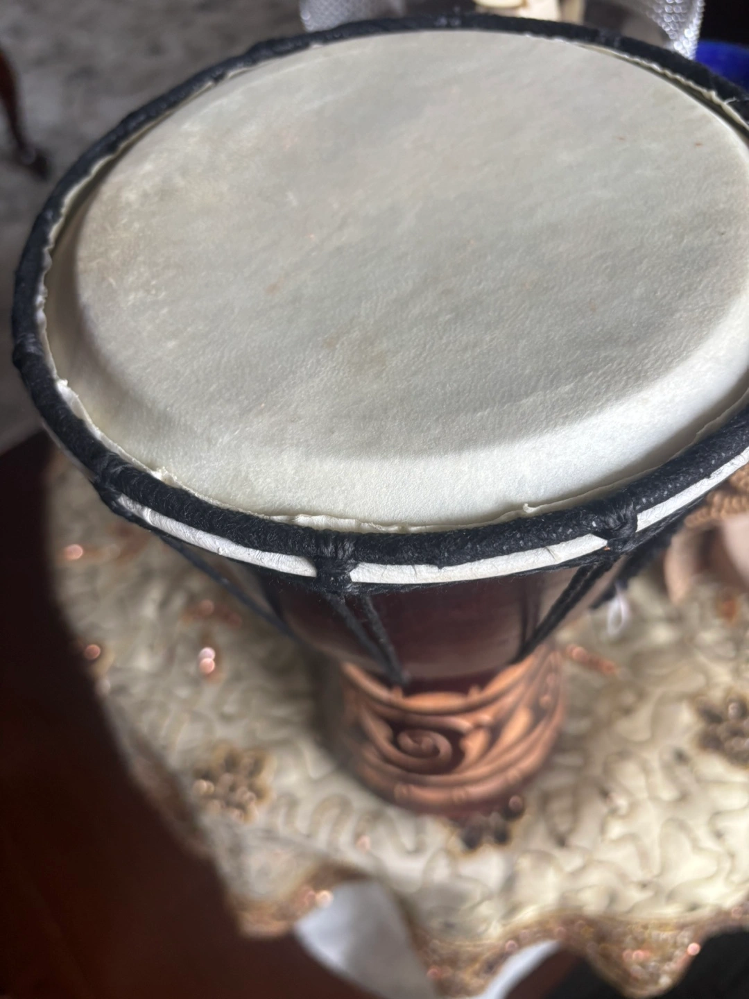 Small wooden darbakie. Dark brown body with carved design. Black rope lacing. White drumhead. Great for decoration or small-scale performances.