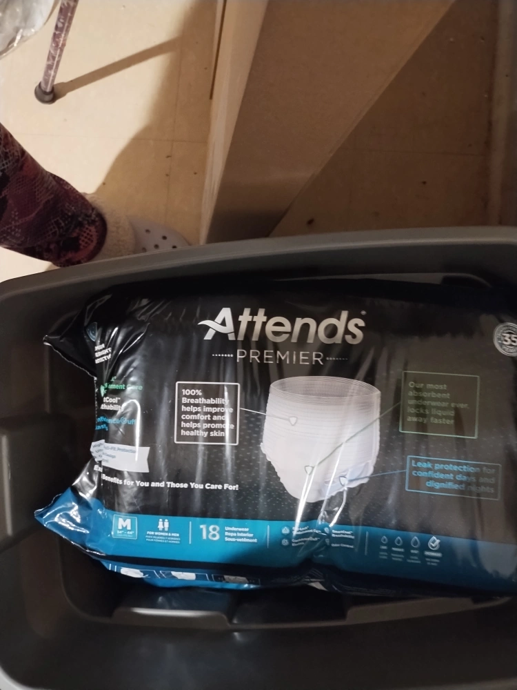 New, unopened package of Attends Premier absorbent underwear. Leak protection for confident days and dignified nights. Medium size, 18 count. Most absorbent underwear ever, locks liquid away faster. 12packs available. unisex. 3 boxes of 4 packs. $30 each or 2 for $50