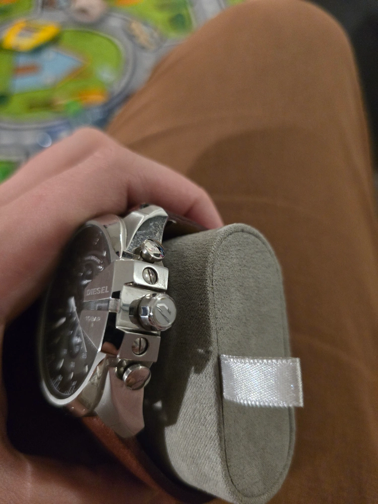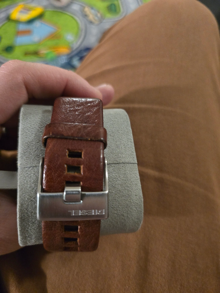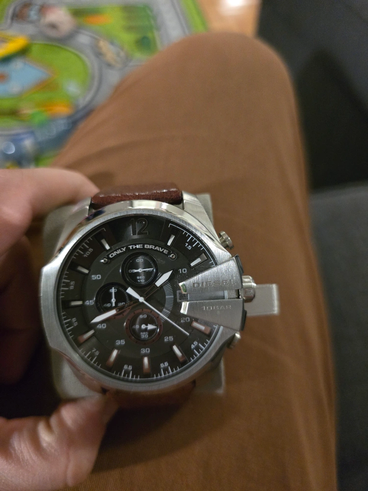 Men's Diesel Only The Brave chronograph watch. Brown leather band. Stainless steel casing. Pre-owned. Needs a battery. Priced accordingly.