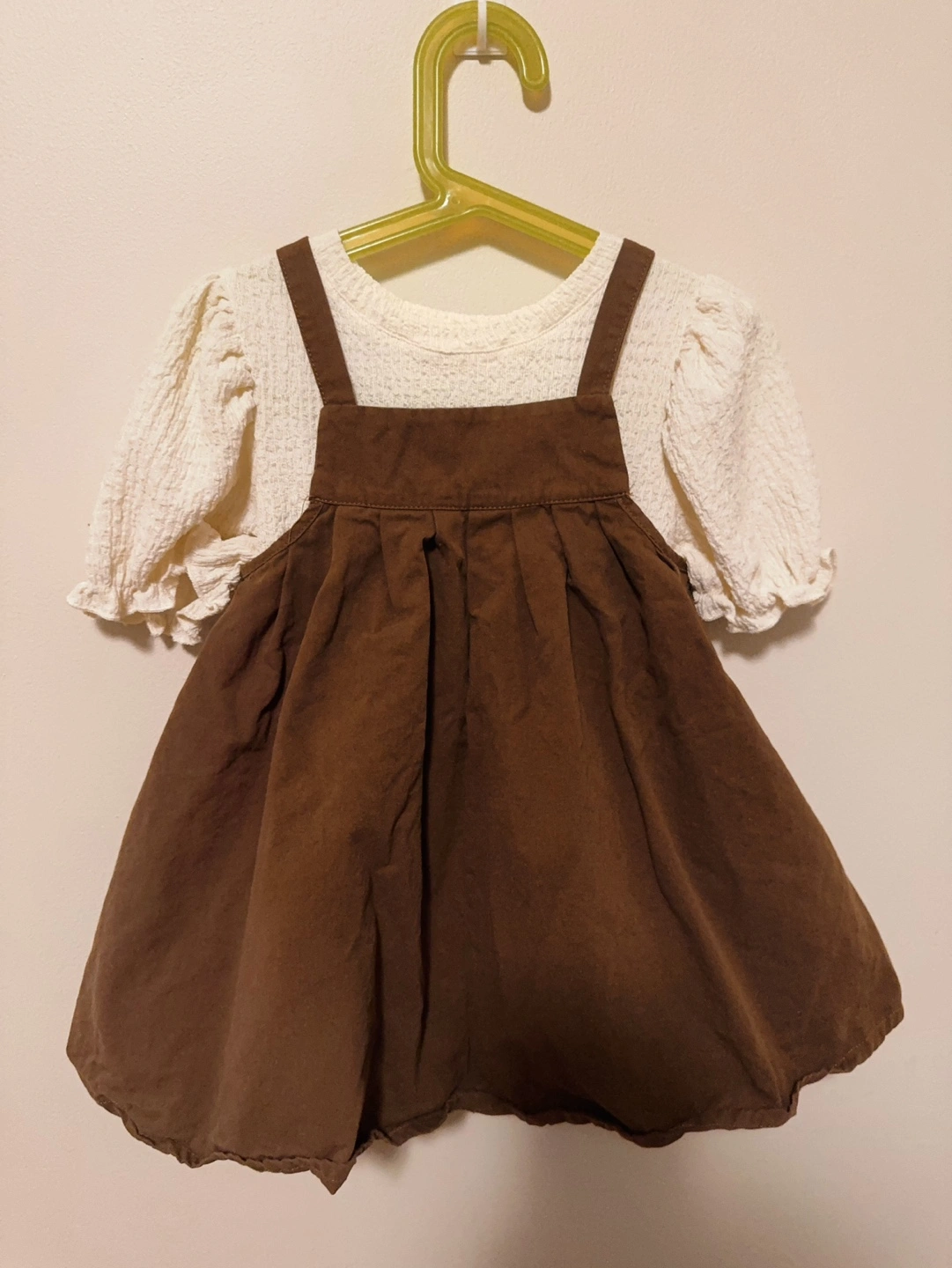 Cute 100% cotton two-piece outfit. Brown pinafore dress with embroidered details. Cream puff-sleeve top. Perfect for special occasions or everyday wear.