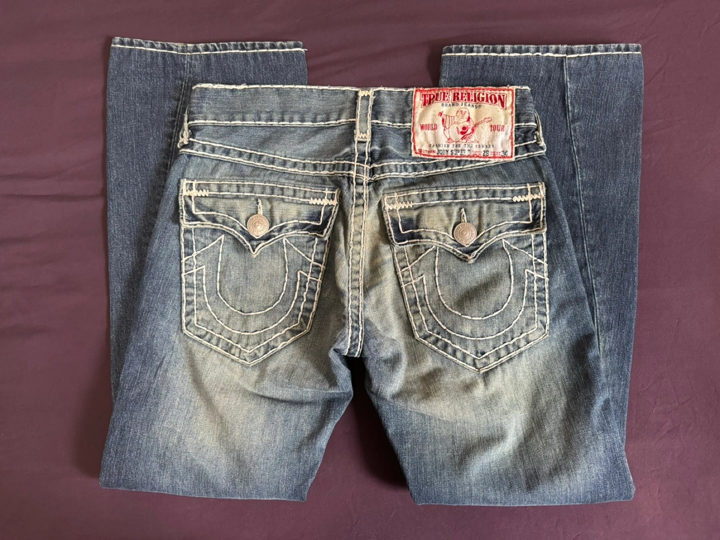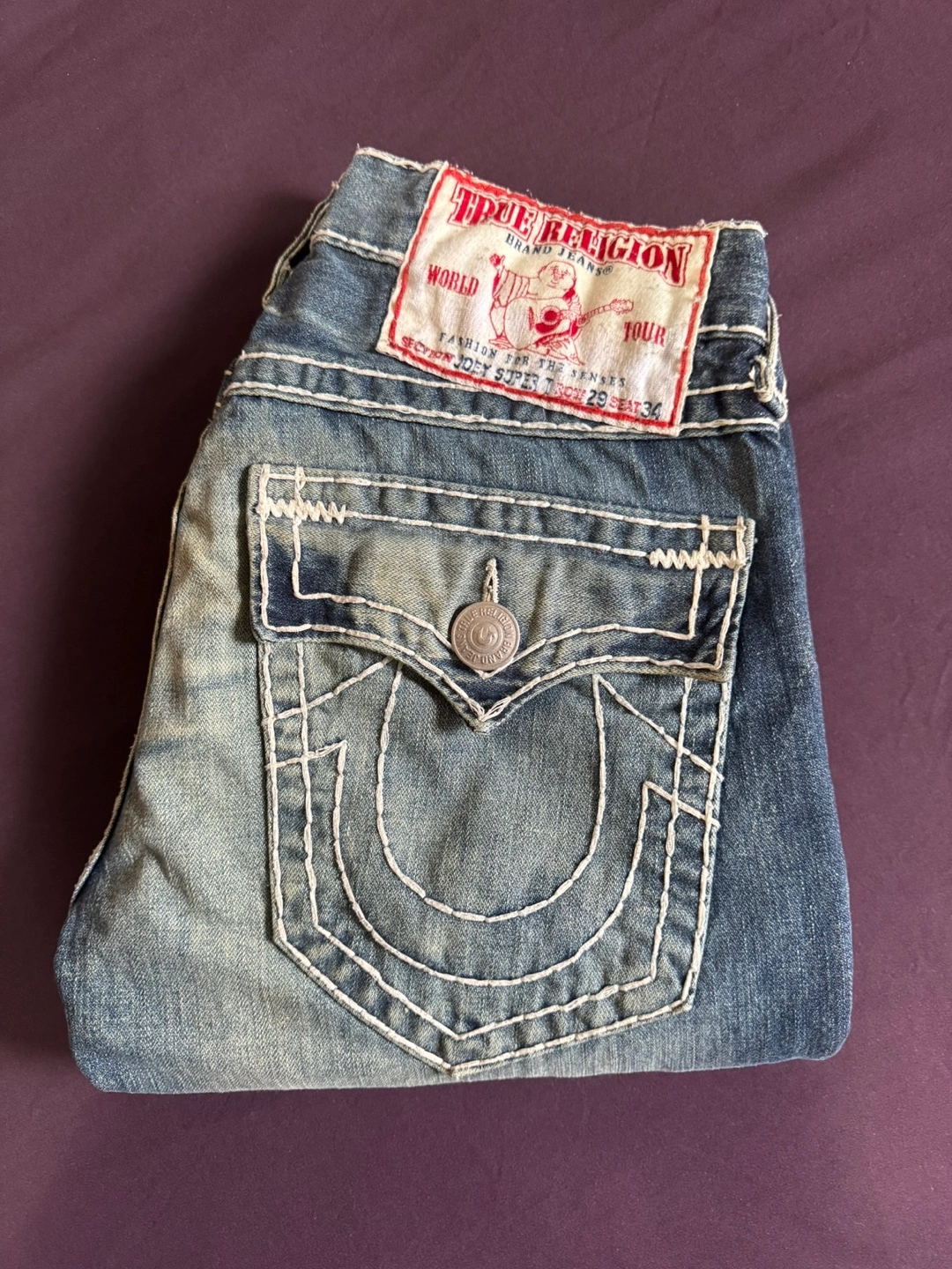 Cash obo or Trades Need gone. Men’s Size 29 Waist x 30 Length Joey Flare Fit / Boot Cut Twisted Inseam White Super T Stitching Big Matte Silver/Copper Buttons & Rivets Very nice Wash / Fading Made in USA 2009 100% Cotton 100% Authentic Amazing Condition Any Flaws seen in Photos Ask for measurements if needed Check out my Page for more True Religion & Similar Brands, Also have other pairs & looking to Purchase/Trade for more True Religion Cash Pickup only Oshawa.