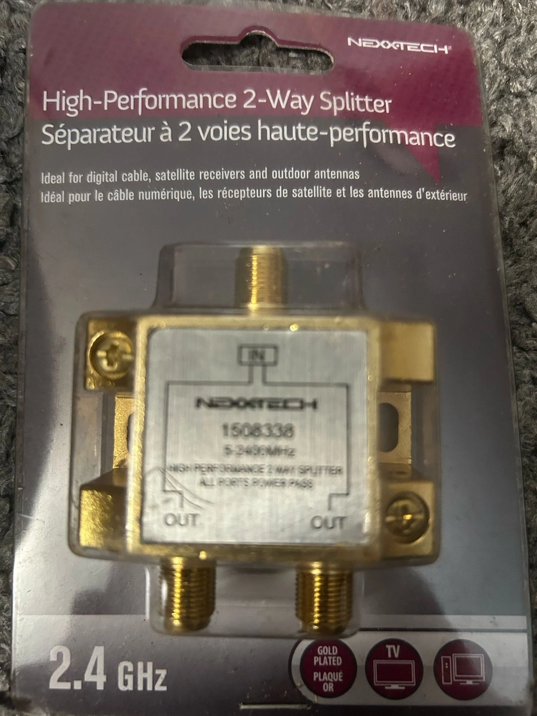 Gold-plated 2.4 GHz splitter. Ideal for digital cable, satellite receivers, and outdoor antennas. All ports power pass.