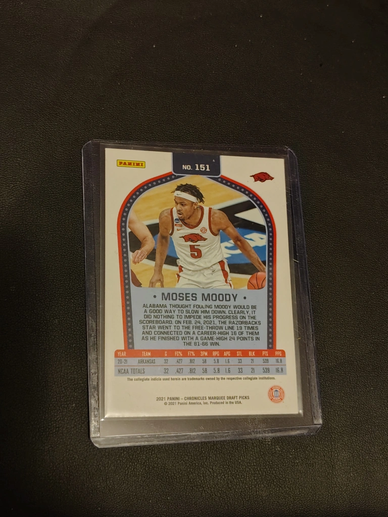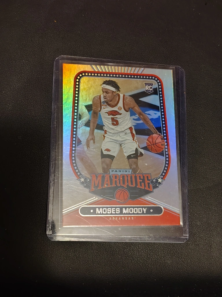 Panini Prizm Marquee Draft Picks trading card. Features Moses Moody, Arkansas. Rookie card. Numbered #151.